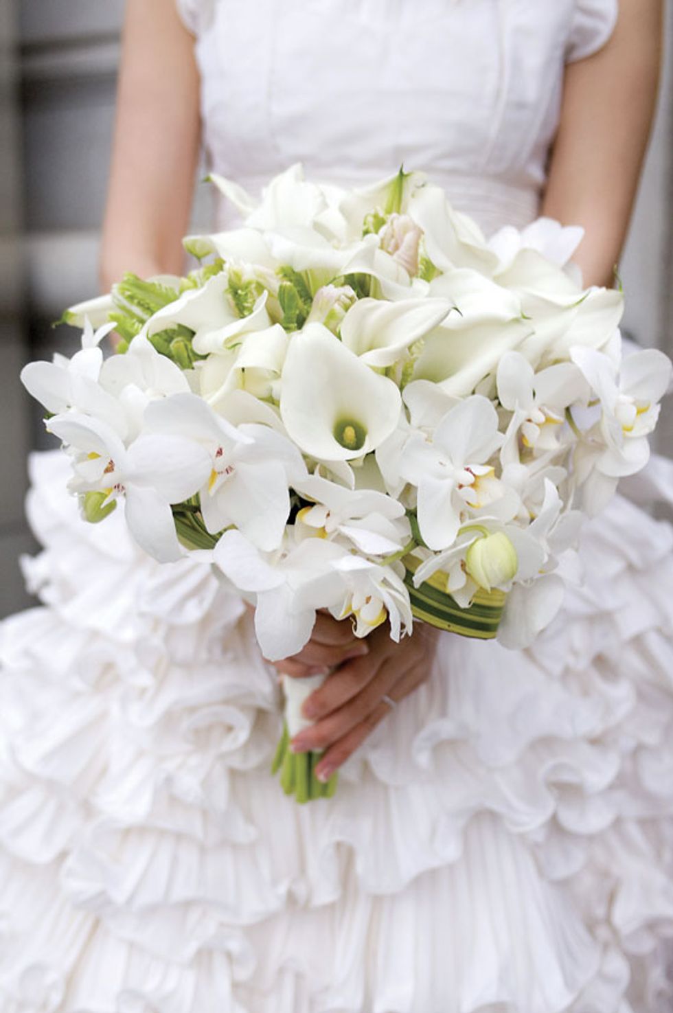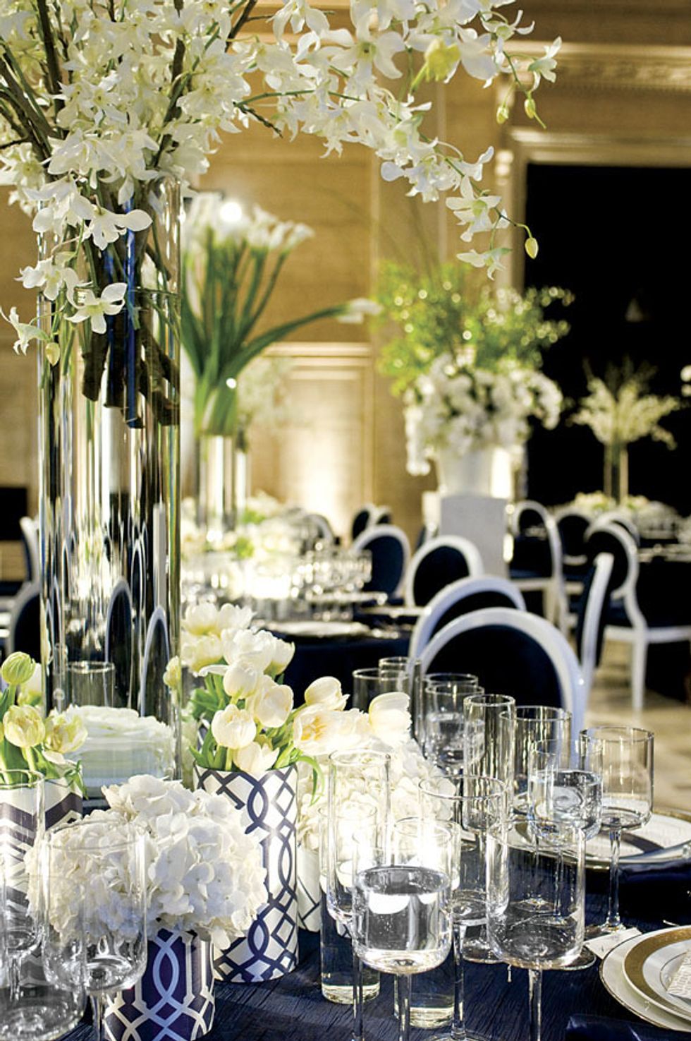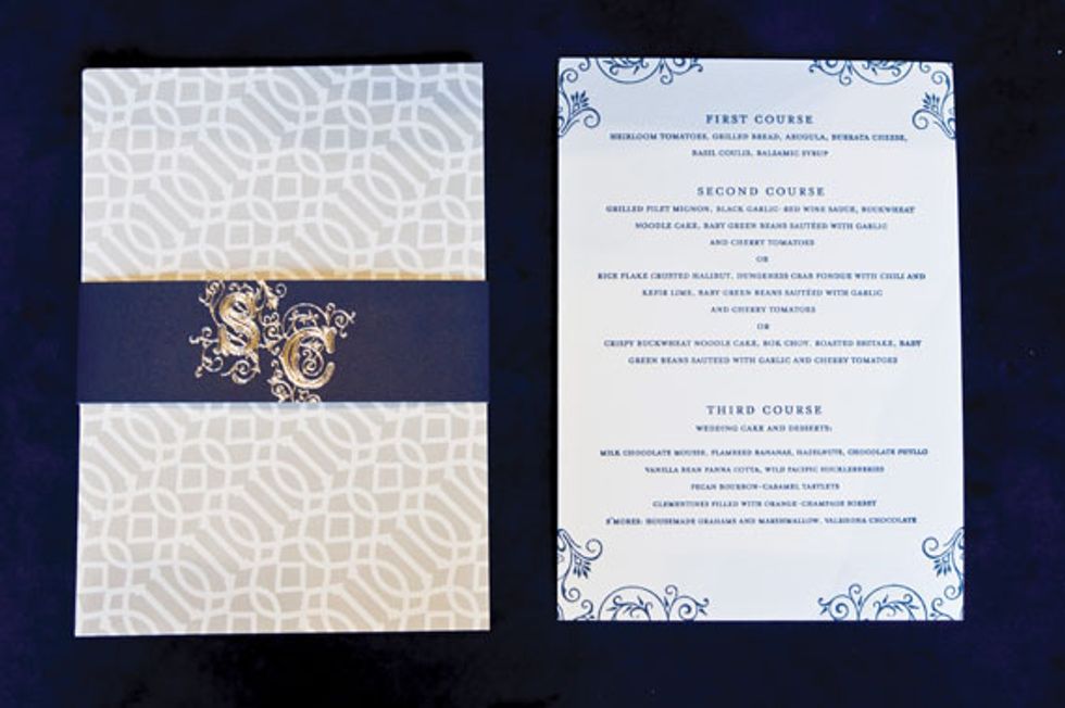 Tall, white floral arrangements towered over tables dressed in the crisp color palette. Calligrapher Tracy Joe created the handwritten materials. The evening's menu was sealed with a band bearing the couple's initials stamped in silver foil. The museum's Samsung Hall was the setting for the reception, which was designed to feel more like a chic, cosmopolitan dinner club gathering than a traditional wedding reception.