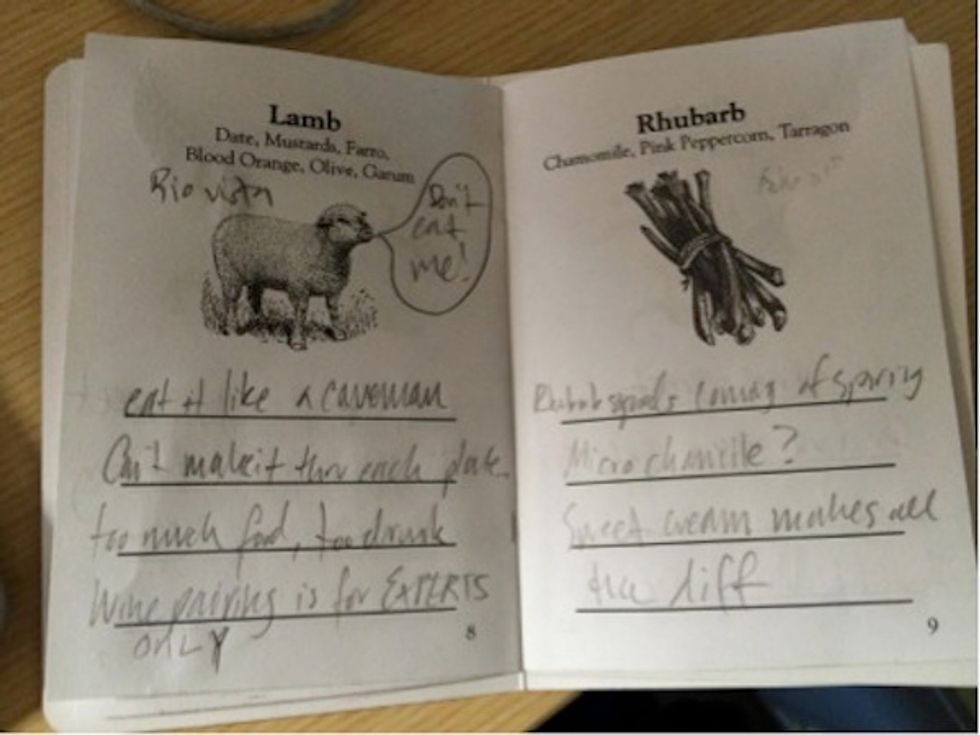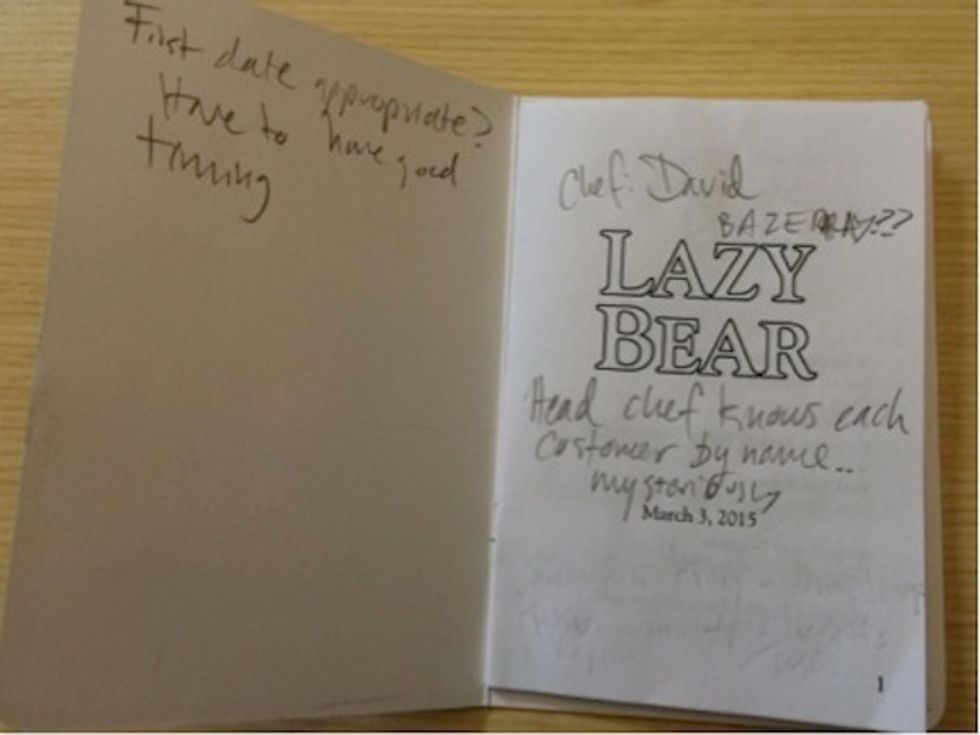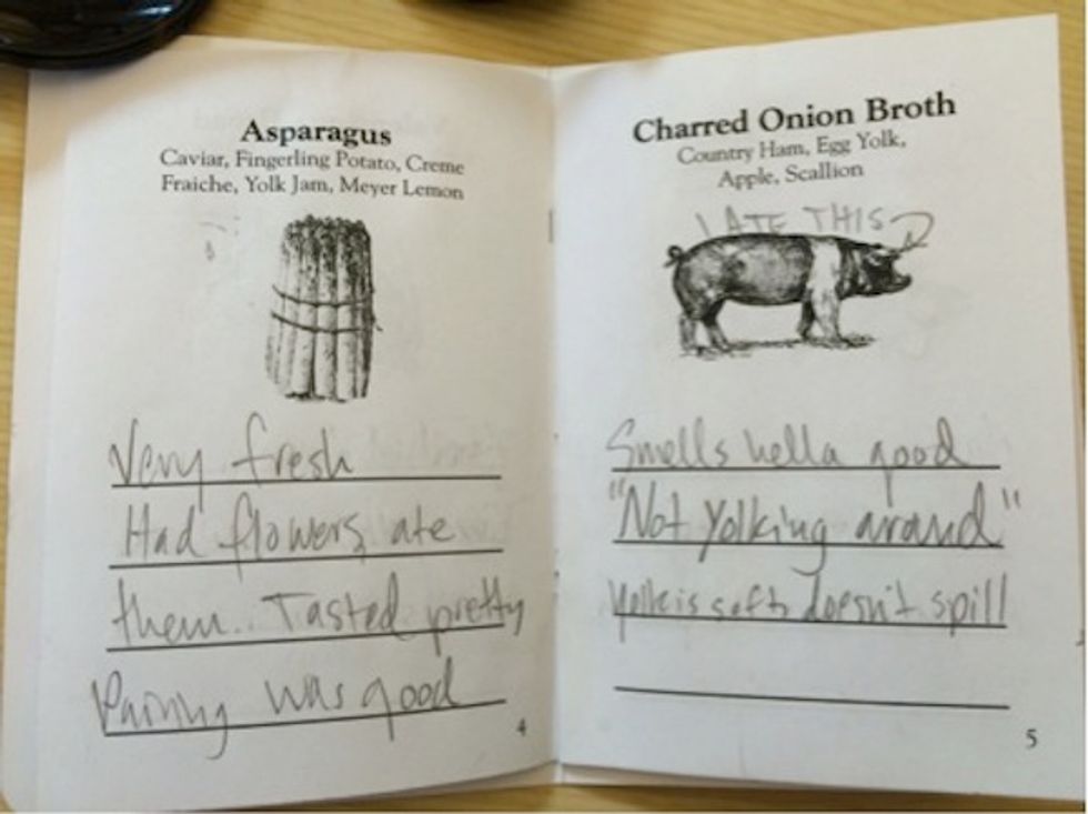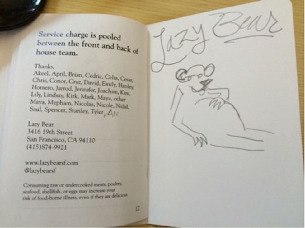 Presumably, Lazy Bear expects people to get as drunk as I did, because they provide a booklet of their menu items for diners to take notes on what they’ve consumed. Chef Barzelay and I may share a love of anagrams, but I was not coherent enough to articulate just how truly phenomenal the dishes he served were. Thus my observations include such remarks as, "chef recommends eating it," "smells hella good," and "could use more salt overall?" You can see for yourself in the pages from my booklet below.