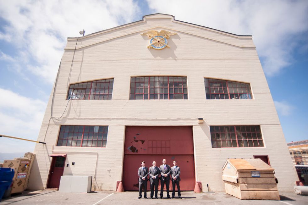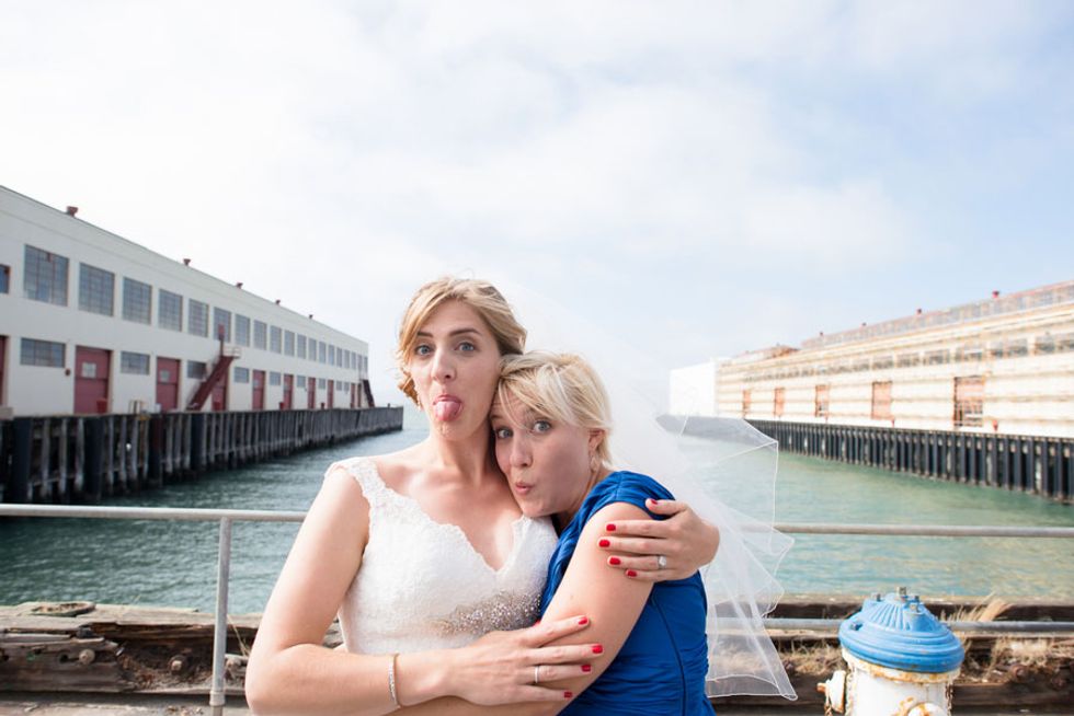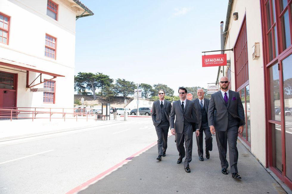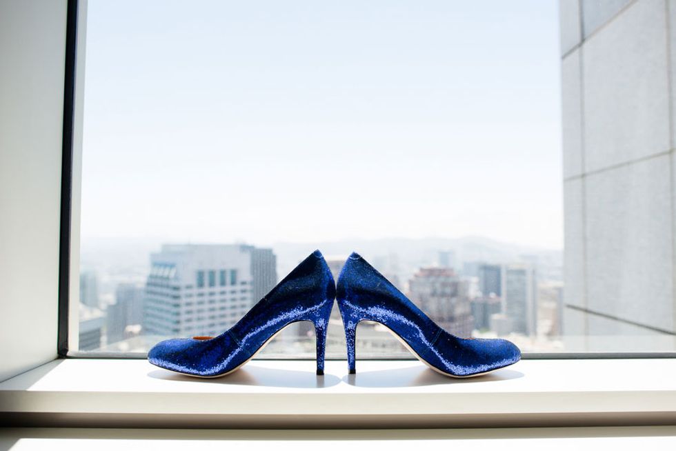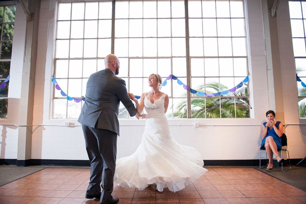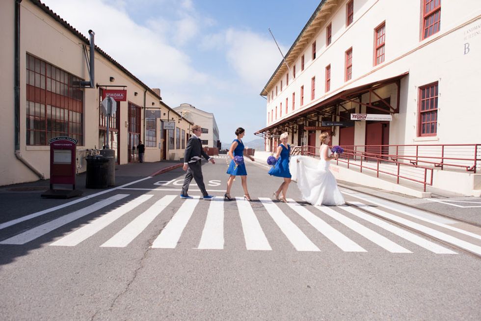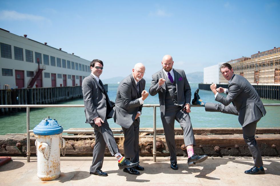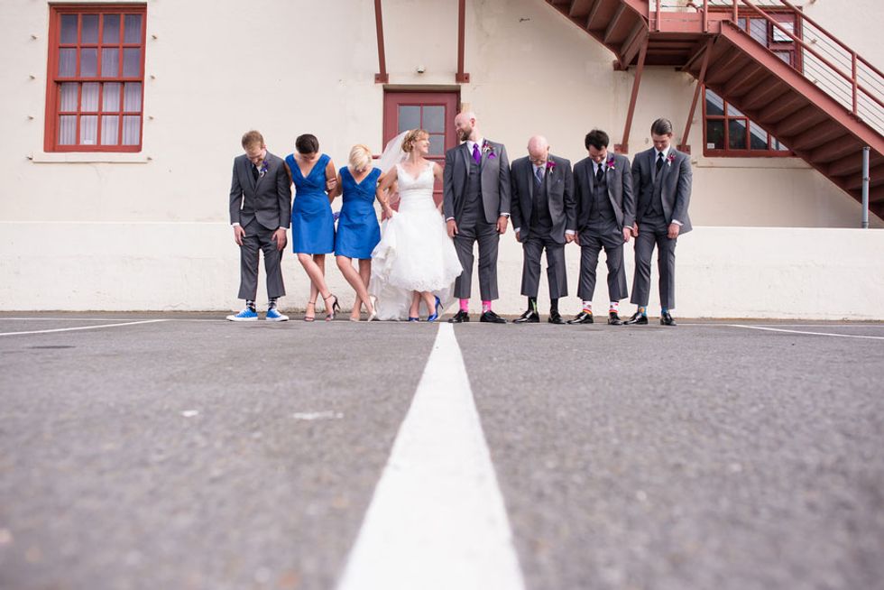 Everything about the couple's Fort Mason nuptials was bright and quirky. Kim dazzled her guests with bright blue, sparkly shoes (her "bridesman" wore blue Converse to match) and the groomsmen proudly showed off their mismatching, patterned socks.