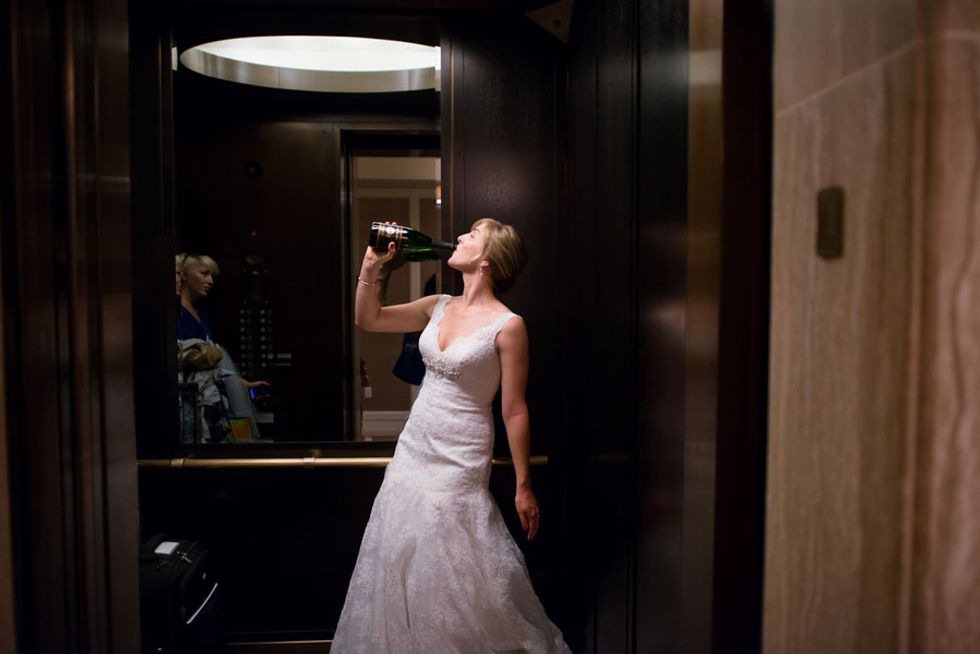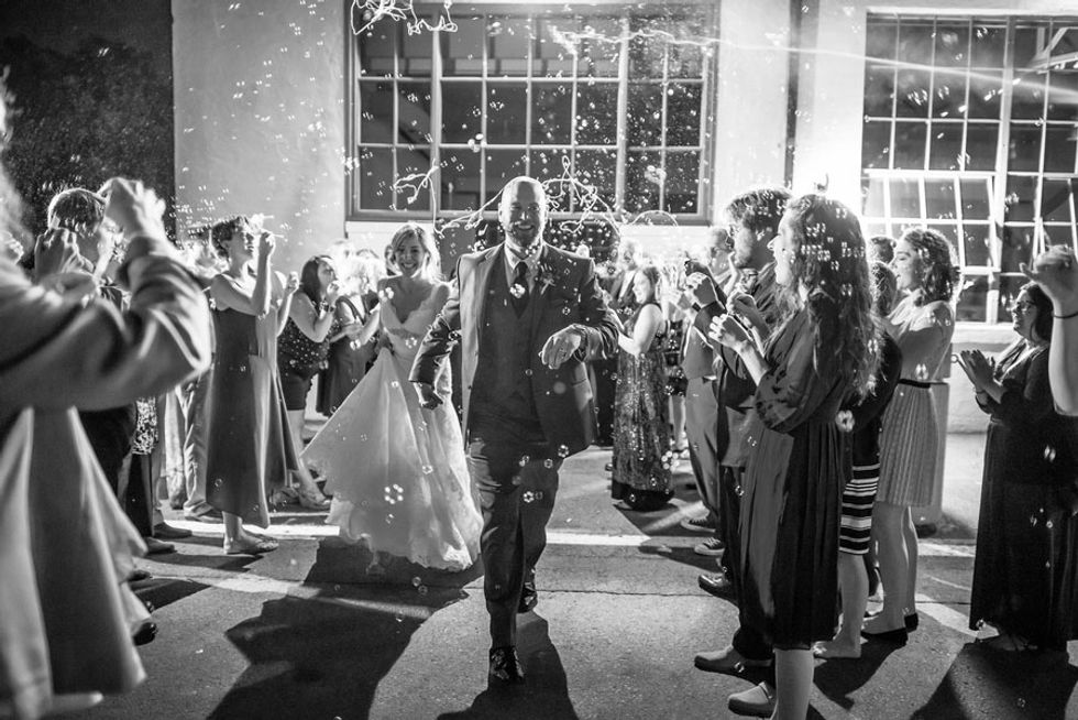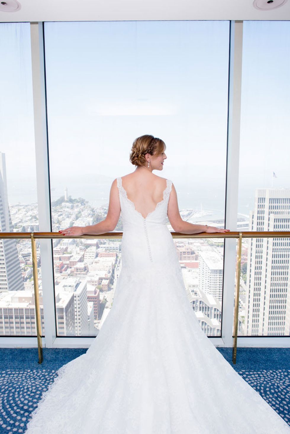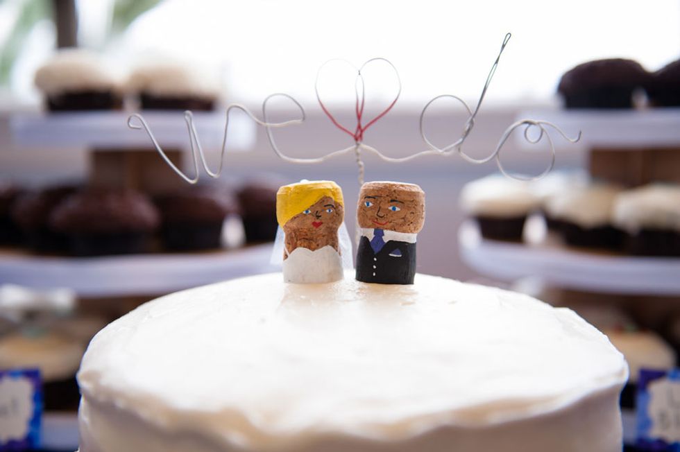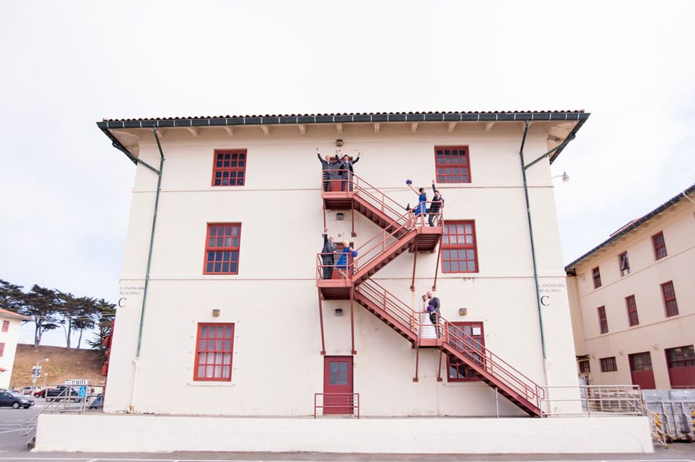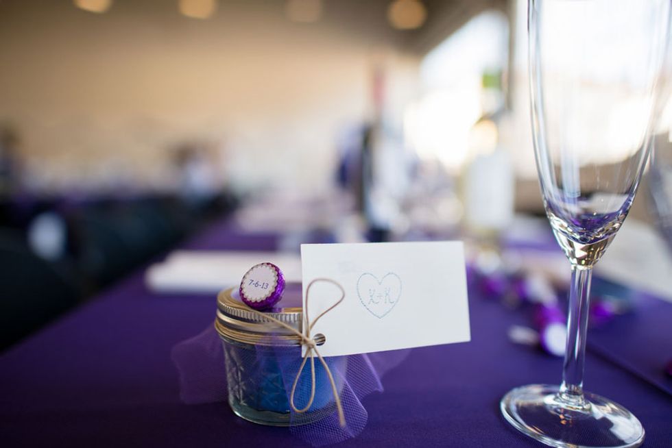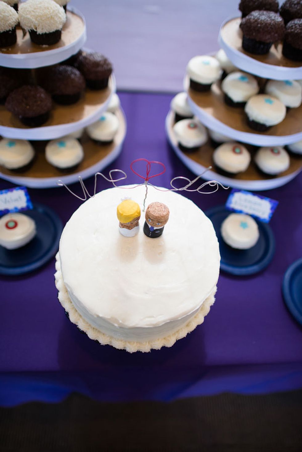 Everything about the couple's Fort Mason nuptials was bright and quirky. Kim dazzled her guests with bright blue, sparkly shoes (her "bridesman" wore blue Converse to match) and the groomsmen proudly showed off their mismatching, patterned socks.