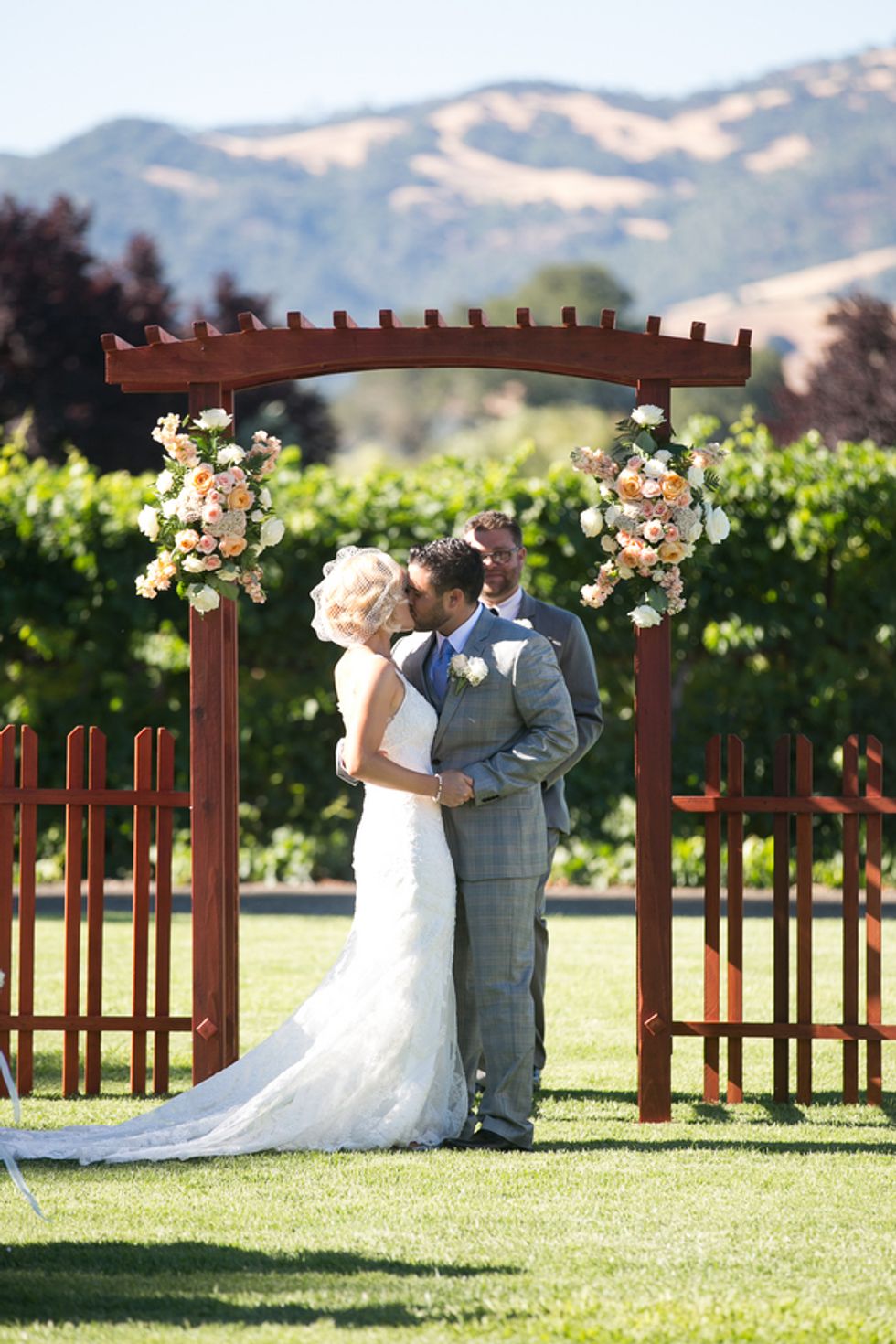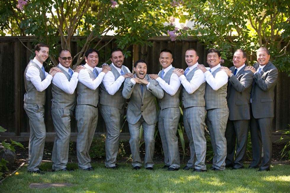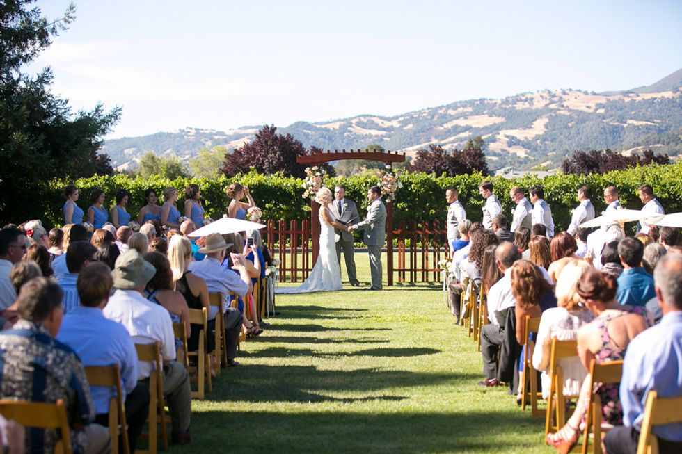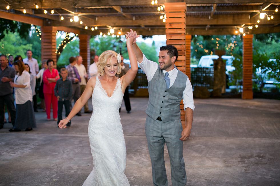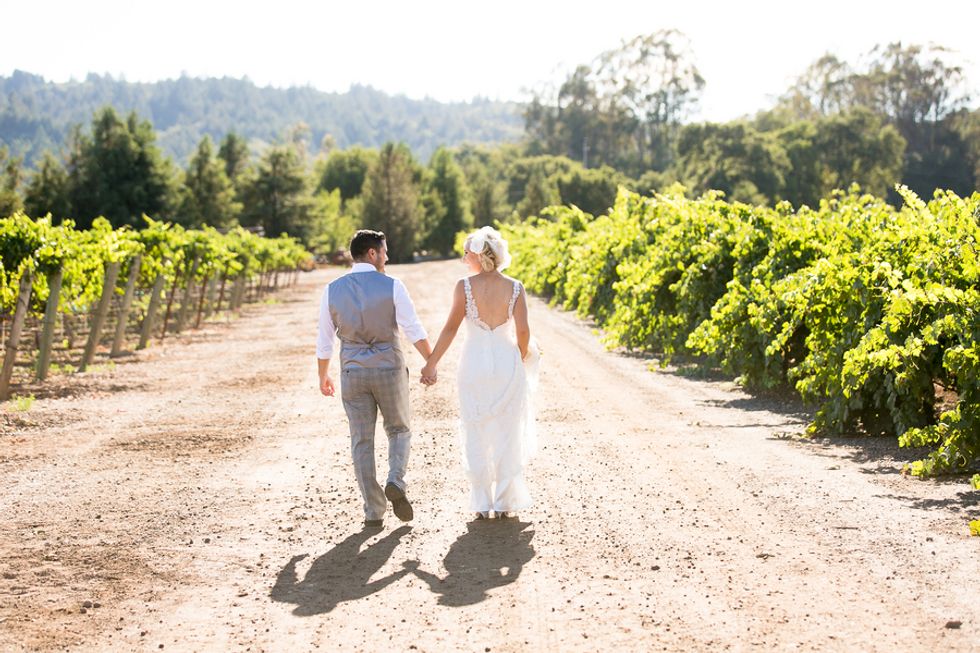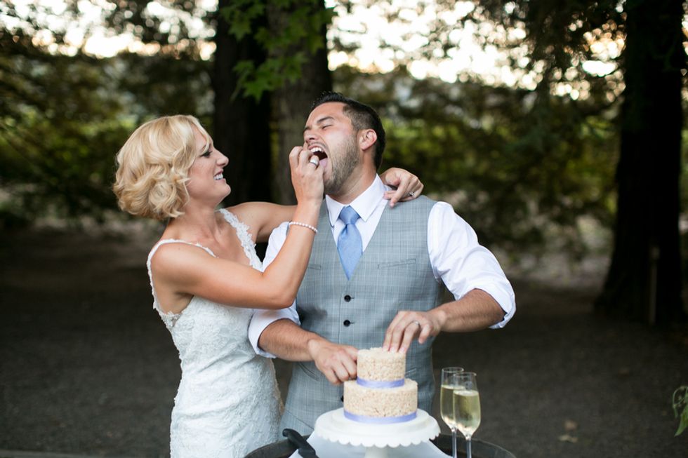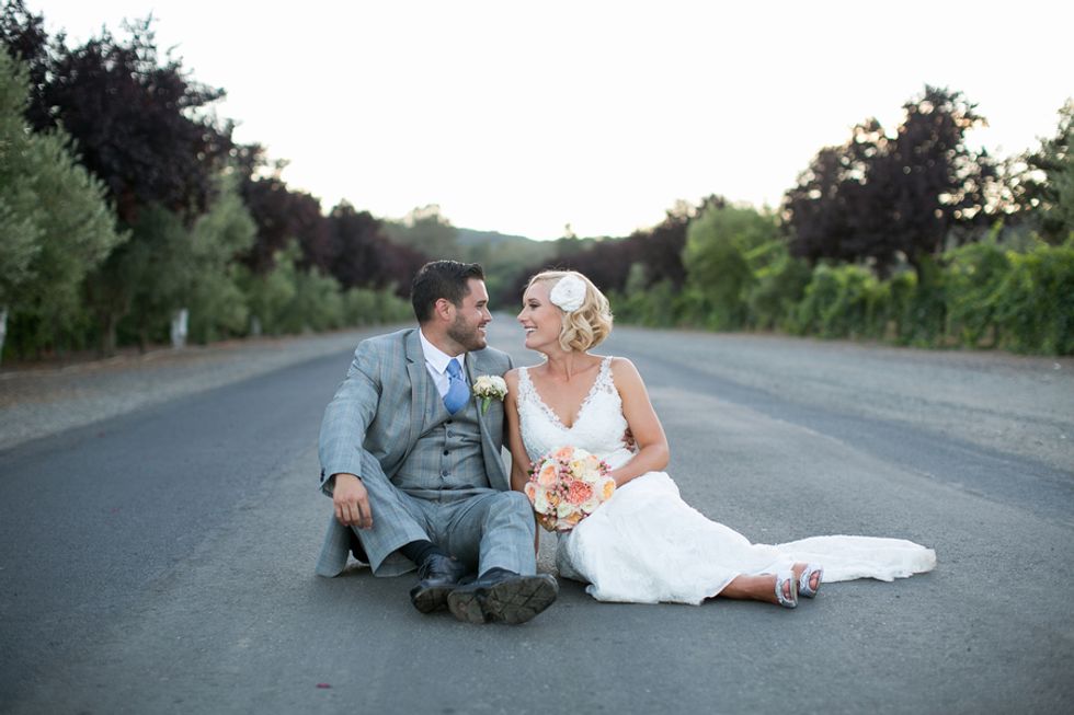The couple's wedding style reflected a taste for the whimsical in a rustic outdoor setting. The pair said "I do" amidst rolling vineyards and sprawling hills at the beautiful Trentadue Winery in Geyserville. Emily's lacy, backless dress was offset by a groom's party adorned in plaid. Following the ceremony in the foothills of Napa Valley, the reception took place in a casual, indoor/outdoor space highlighted by wood finishes and sparkling string lights. The couple capped their big night by cutting a Rice Krispie cake before sharing their first dance as husband and wife.