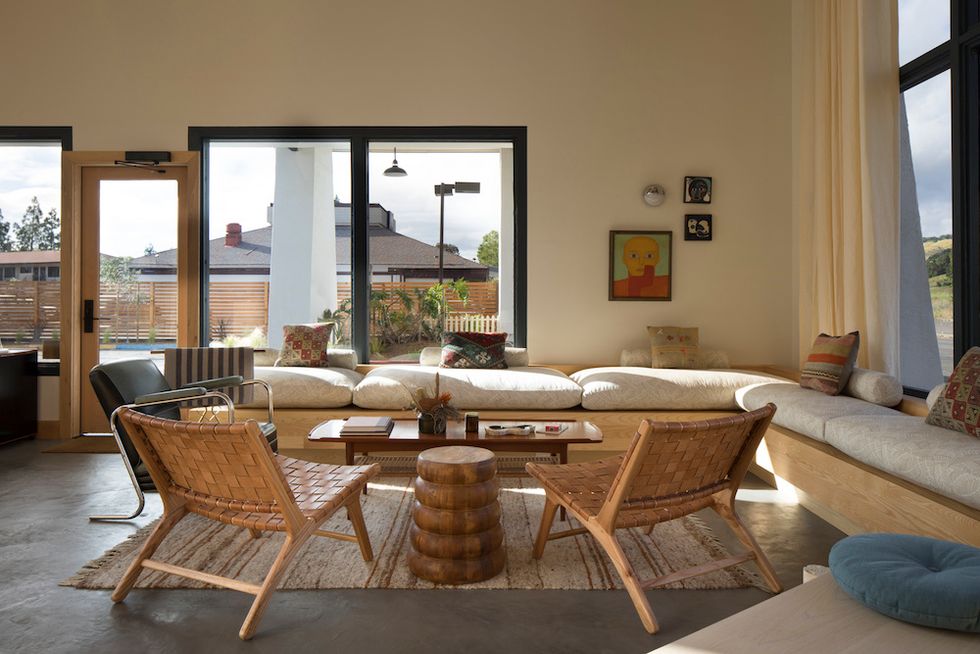Order up a glass of frosé or a refreshing cocktail—think, vermouth and lemonade or a blood orange margarita—from the pool house window, which also serves up beer and wine by the glass, bottle, or can. A menu of locally sourced poolside snacks include a soft pretzel, hummus plate, and sweet treats from the fully stocked ice cream cart. Getting too much sun lounging by the pool and hot tub? Seek refuge inside the posh, 1950s pool house. Outfitted with a roll-up glass garage door so you can still be part of the action, the lounge invites you to pull up a stool at the bar or wax nostalgic on the bamboo sofa, playing analog games and reading classics like The Hardy Boys or books by Kurt Vonnegut.