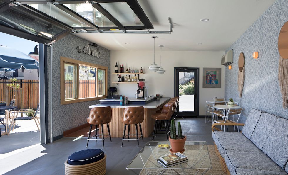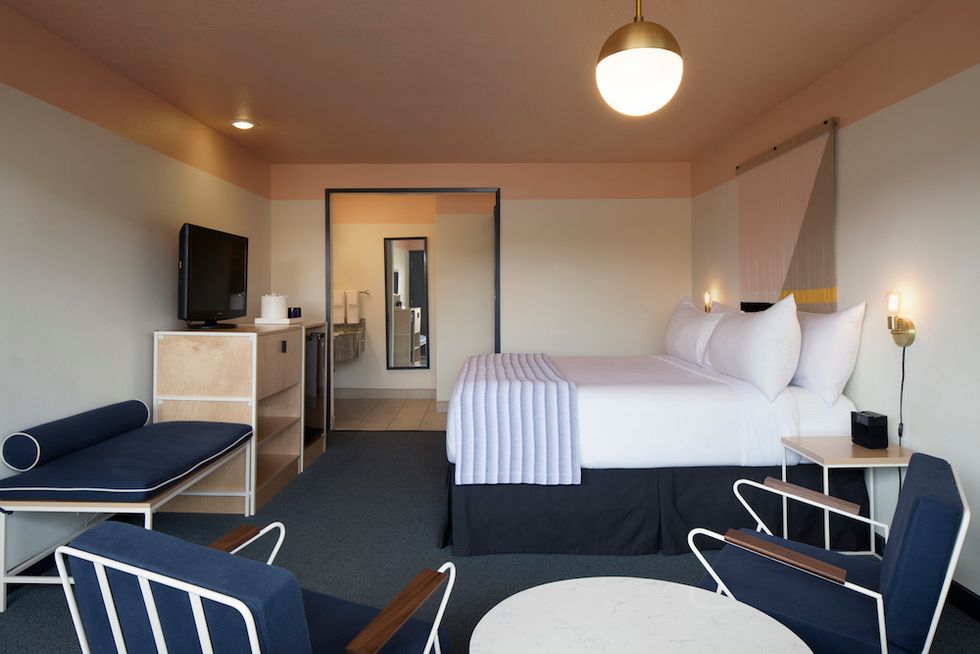When the fires struck, the 40-year-old roadside motel was putting the final touches on its massive facelift. Starting with a new paint job, the hotel has rebranded with an airy, beach-inspired color scheme of light pink, navy, and neutral tones. The update is immediately apparent in the chic, Palm Springs–inspired lobby, where you'll likely check in with Annie. The Sandman's "resident grandma," she's worked at the hotel for nearly 30 years and continues to do so at the age of 81. Rumor has it she's sometimes visited by the very friendly ghost of her late husband, who likes to check up on her from time-to-time.