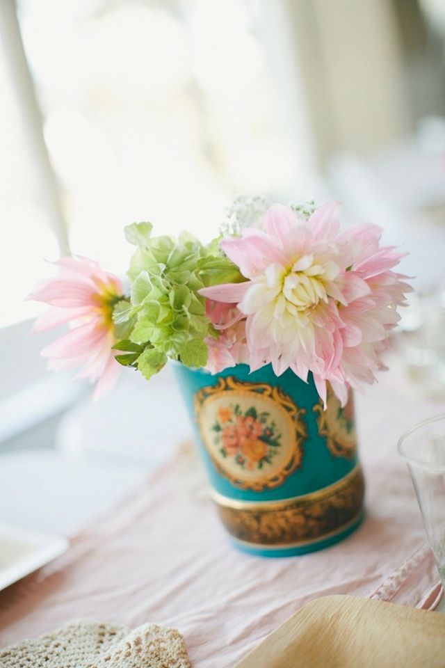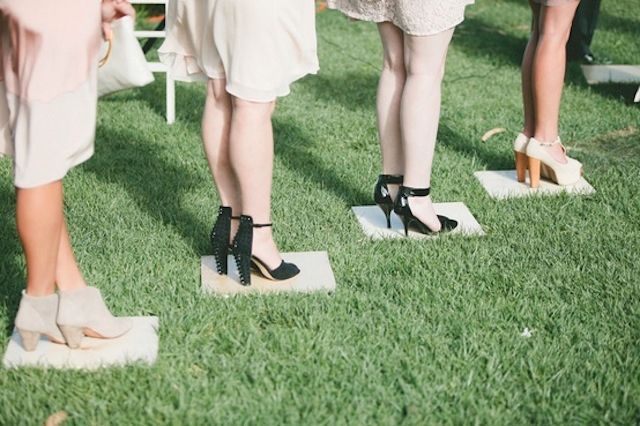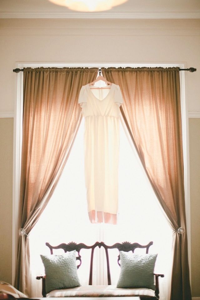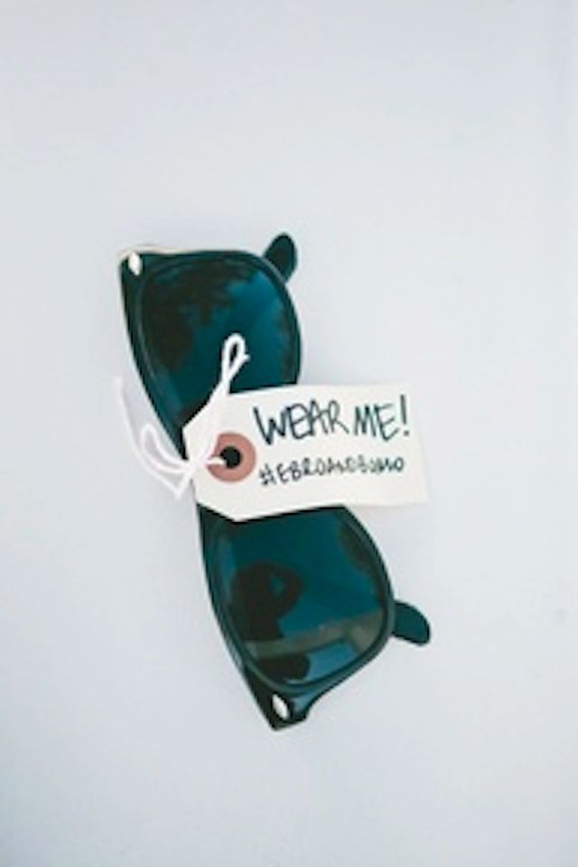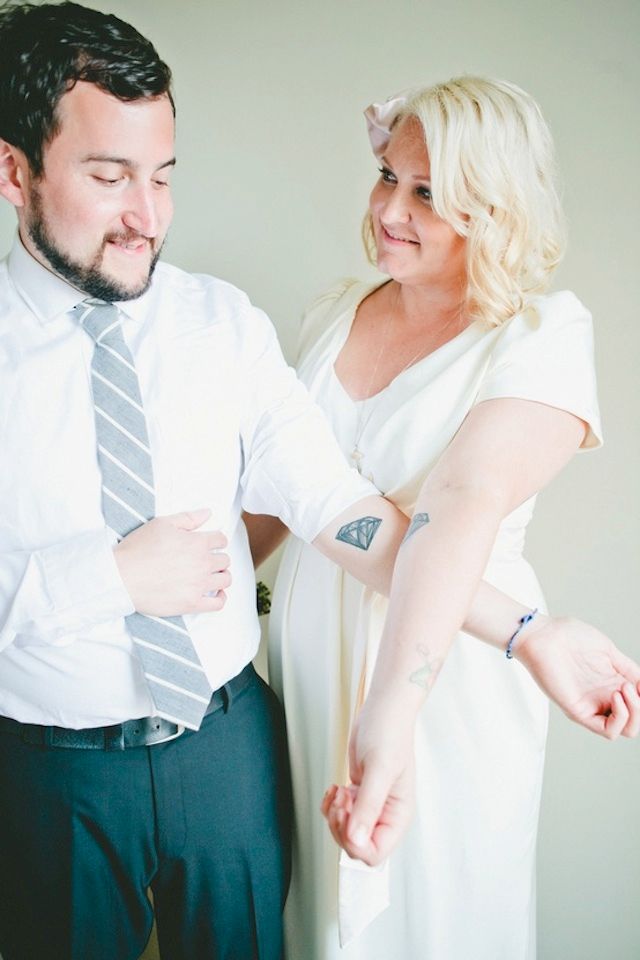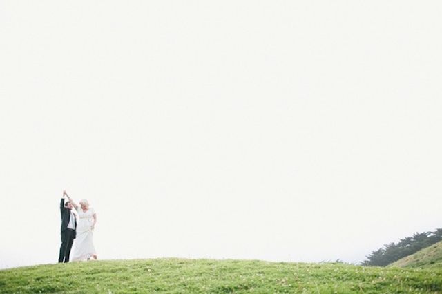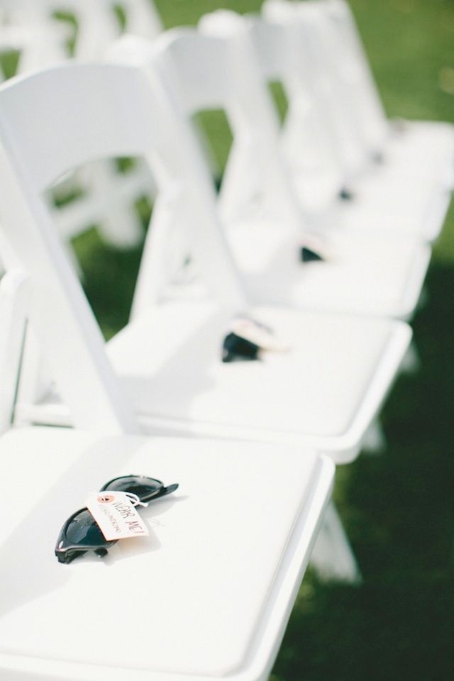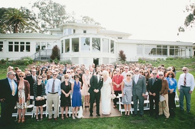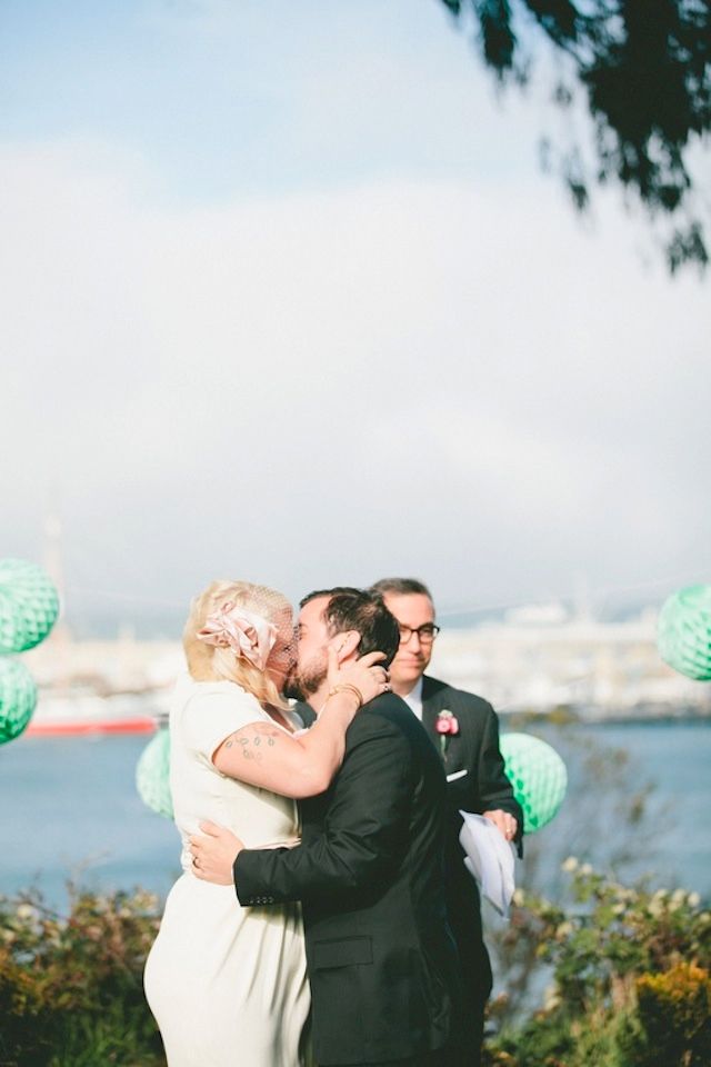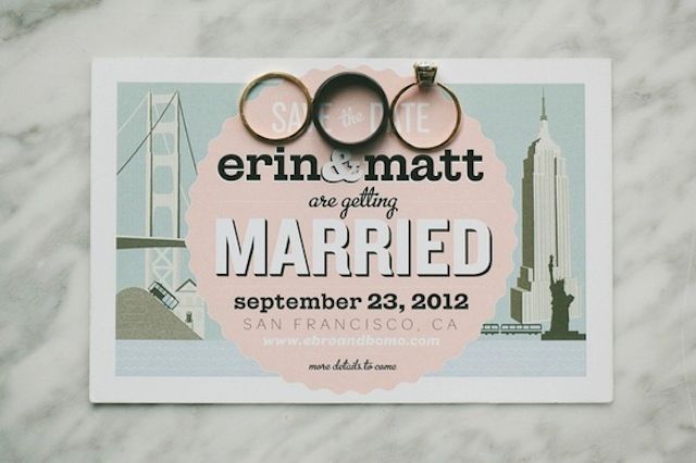 Erin Brown and Matt Valerio got married at Fort Mason in San Francisco. The invites, designed by a good friend, included the Golden Gate Bridge and Empire State Building to signify where the couple met (San Francisco) and where they currently live (Manhattan). Before the ceremony, they left matching sunglasses on the seat of all attendees so everyone could take a group photo after the ceremony. The sunglasses had a tag with #ebroandbomo and all Instagram posts with the hashtag went to their wedding blog. Instead of bouquets, the bridesmaids carried different vintage clutch purses to hold their essentials, along with different dresses and shoes of their choice.