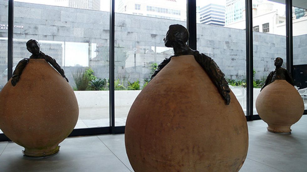 The current installation in the outdoor spaces mixes work from both young and well established artists, including French sculptor Louise Bourgeois, Bangalore-based Ranjani Shettar, American sculptor Joel Shapiro, and feminist artist Kiki Smith. Munoz's Conversation Piece N.Y. (1, 2, and 3), housed inside the pavilion, is among the more striking works, along with Ellsworth Kelly's massive Stele I and Alexander Calder's playful Big Crinkly. Inside the fifth floor galleries you'll find a reinstallation of Between Art and Life, showing some of the contemporary works from the museum's collection, including Rauschenberg's Port of Entry and Andrea Zittel's very cool A to Z 1995 Travel Trailer Unit Customized by Andrea Zittel and Charlie White.