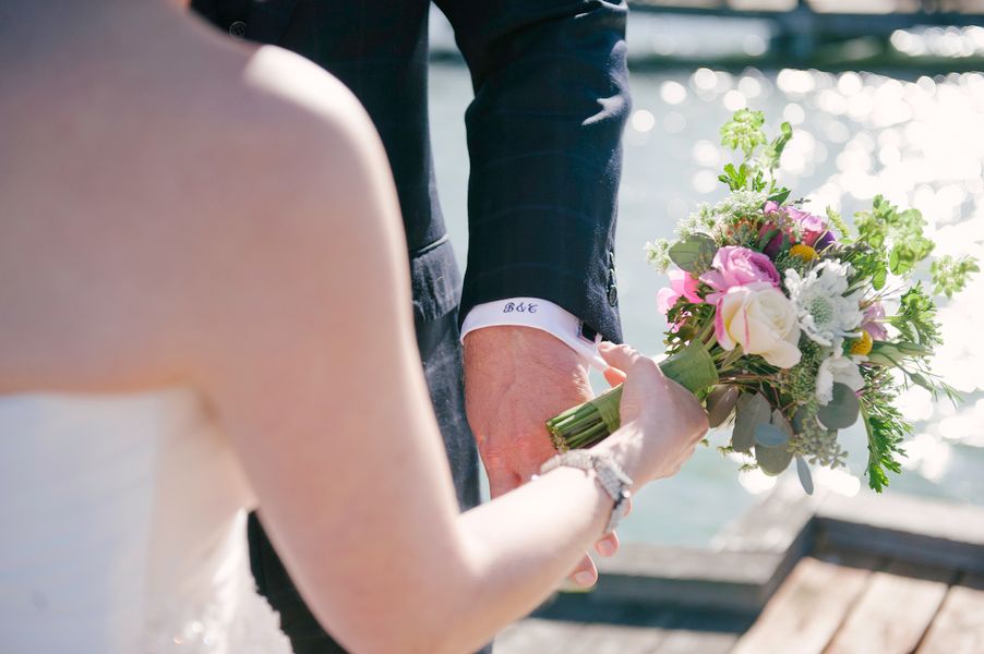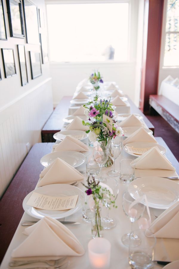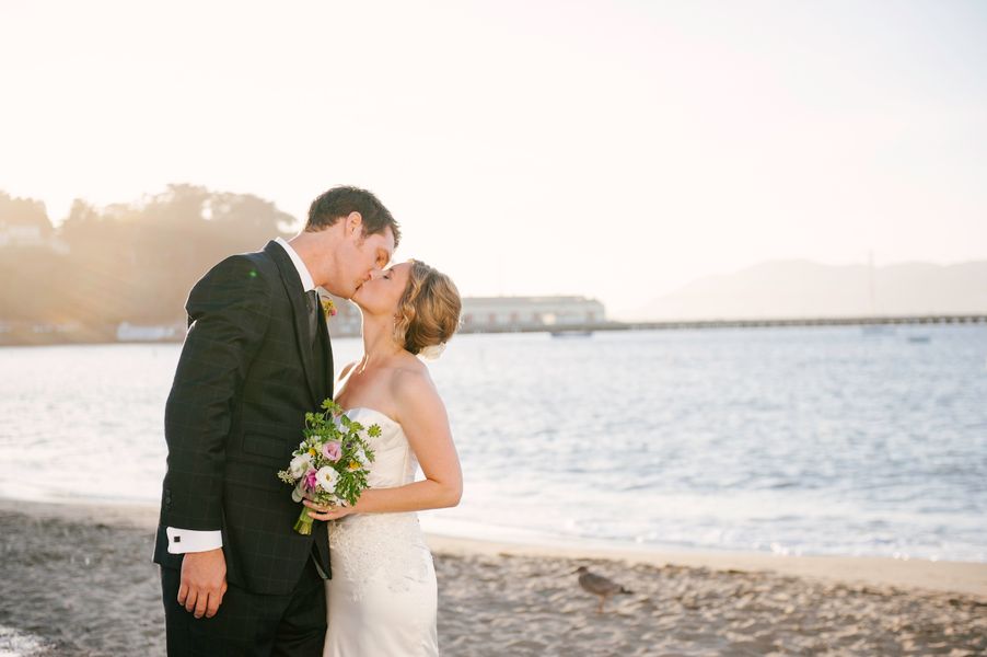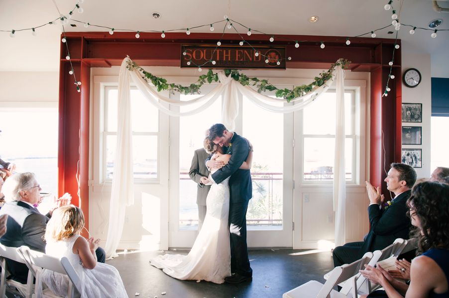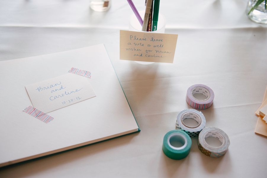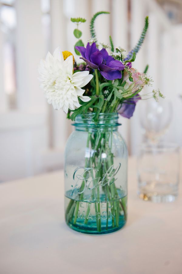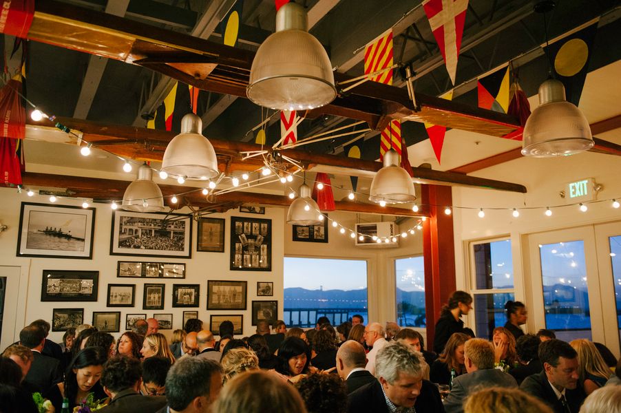 Caroline and Brian tied the knot and celebrated with friends and family at the South End Rowing Club in San Francisco. The bride wore a beautiful dress with vintage jewelry while the groom had a custom embroidered shirt cuff. Teal-tinted Mason jars and decor complemented the simple white linens and dark wood of the Rowing Club. Guests were able to leave little "notes or well wishes" to the newlyweds. The guests enjoyed an intimate delicious dinner followed by a glorious night of dancing.