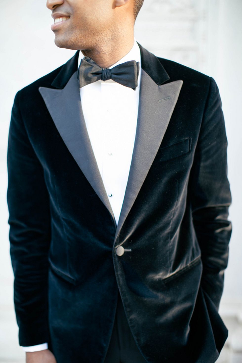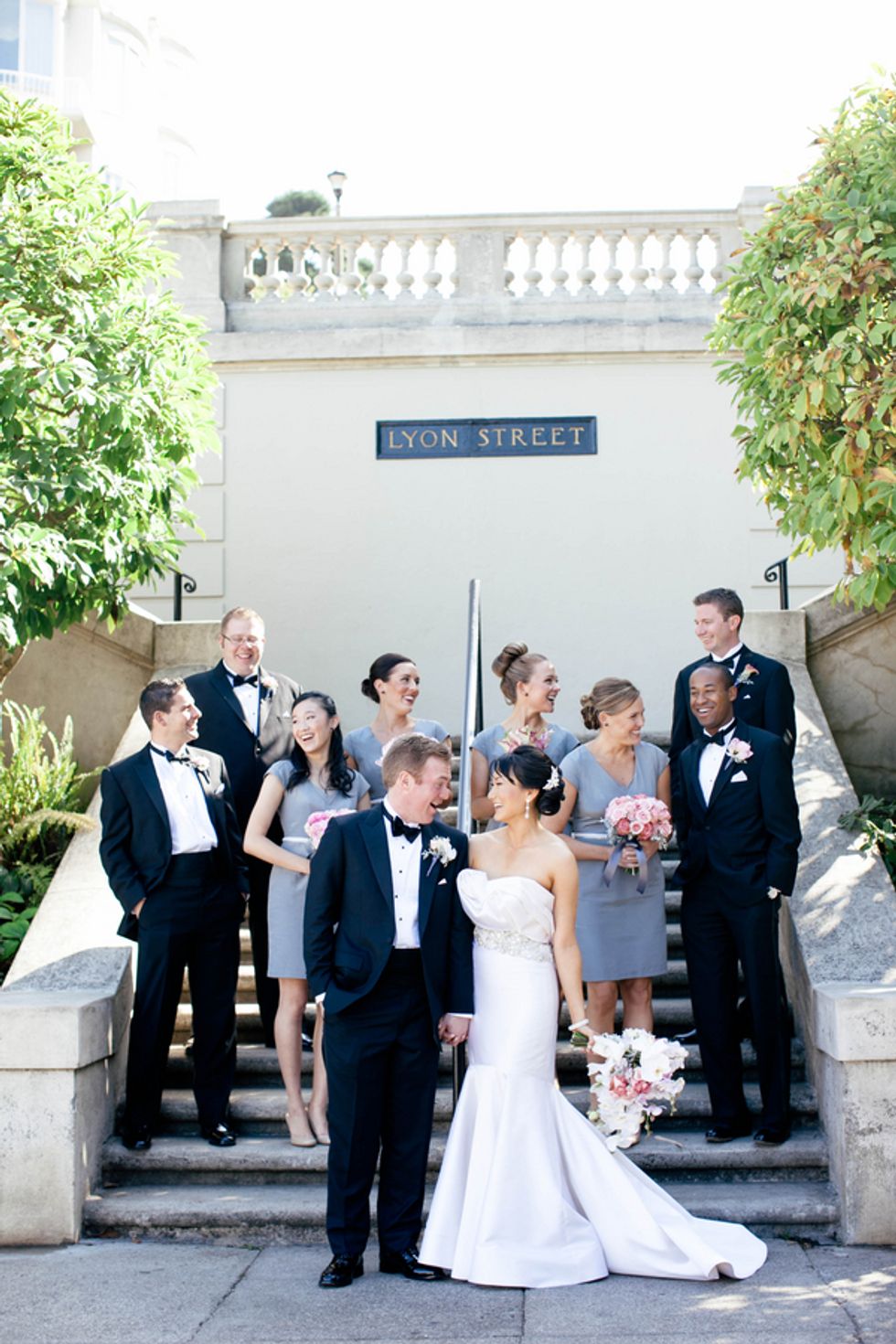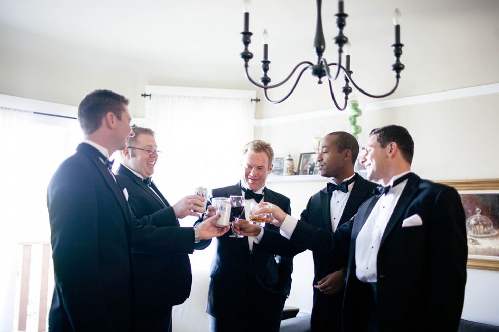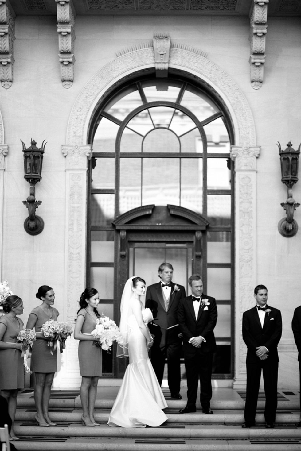 The couple, their party, and the house were all decked out in classy yet subtle style for the affair. Jenny wore an exquisite, mermaid-style strapless gown, her groom and his groomsmen embraced sharp bowties and velvet accents, and pastel flower arrangements graced the granite jardinières.