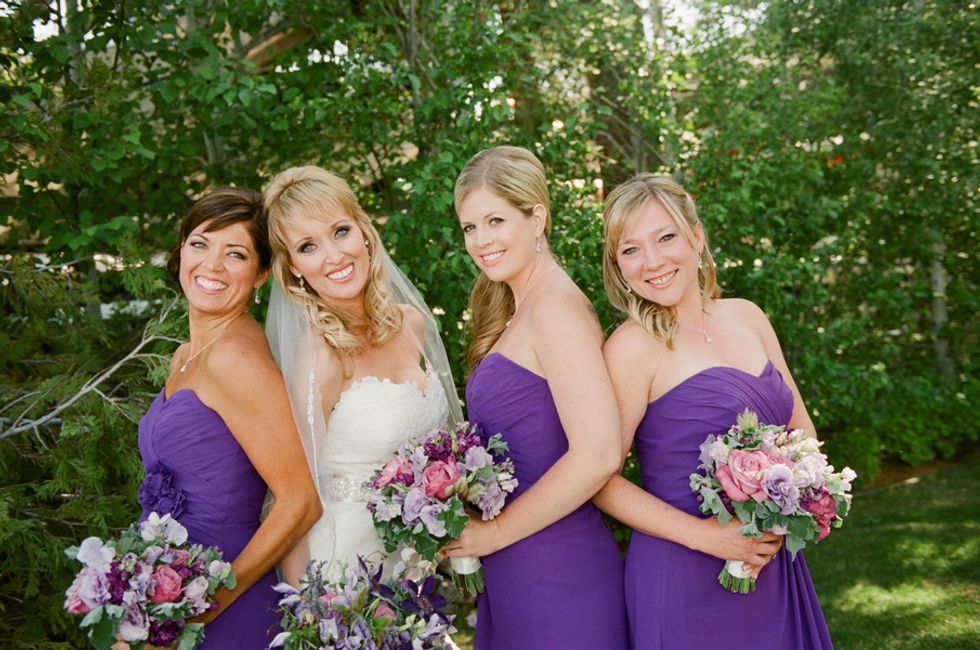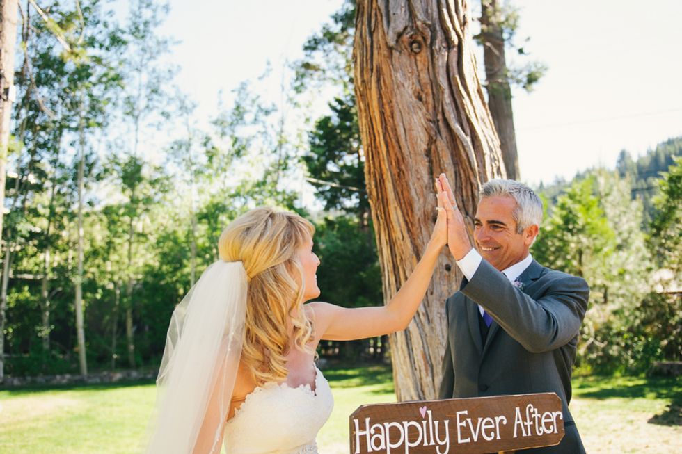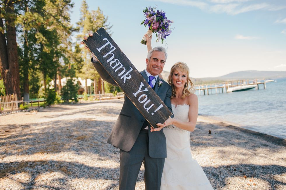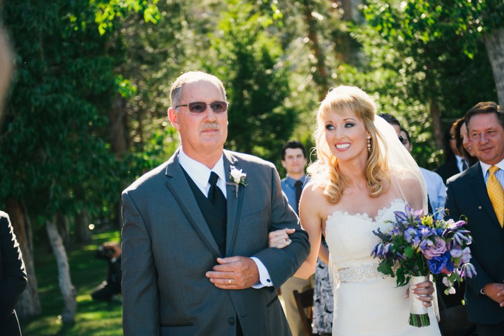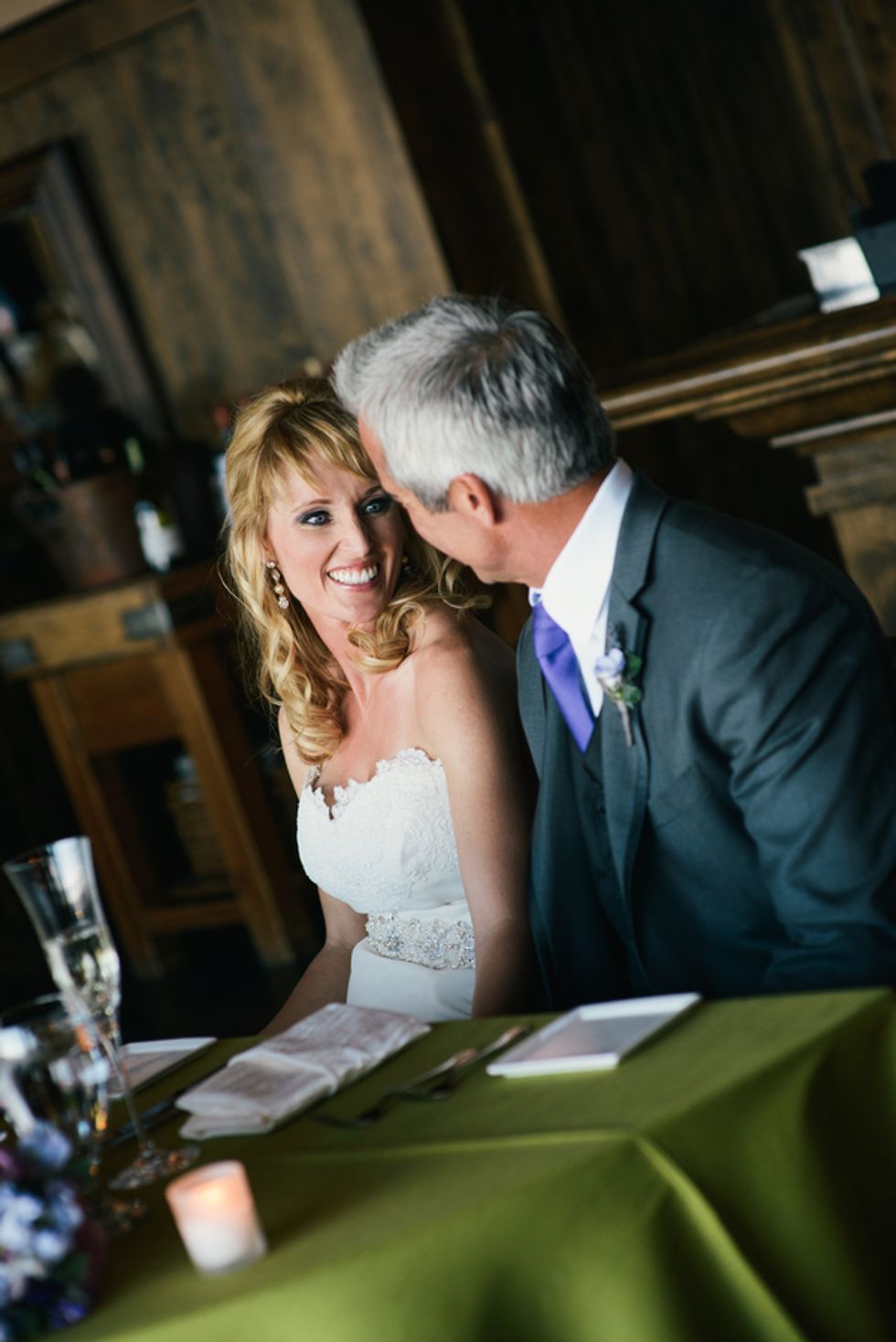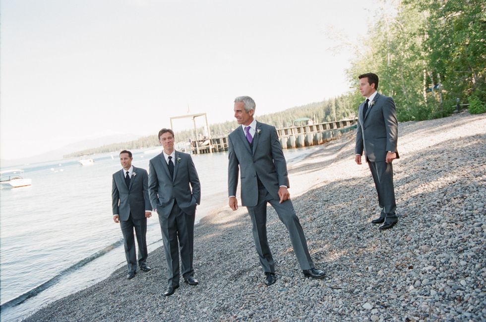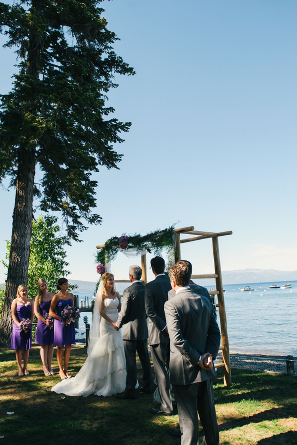 The purple and green themed nuptials provided a bright accent to the gorgeous lanscape where the ceremony took place, and guests enjoyed a spectacular view of Lake Tahoe while the couple said, "I do."
