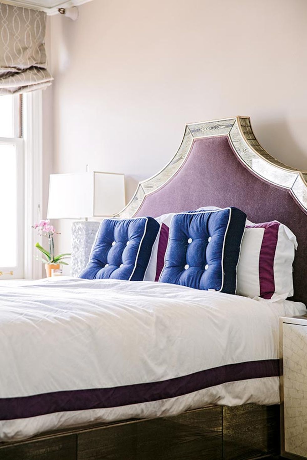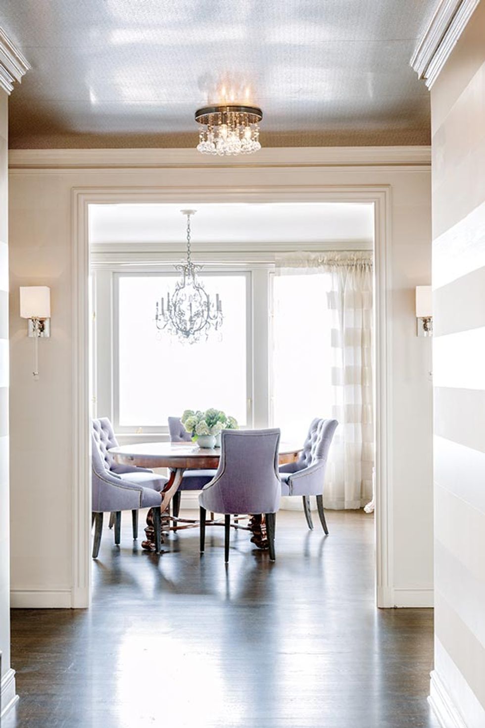 Gray’s art collection ranges from a 16th-century leather engraving depicting a violent assault scene to a Patrick Hughes original 3-D painting above the mantel to a Seurat-inspired ceramic sculpture of a seated man by SF Art Institute alum Angel Cho. While Pfeiffer preferred the crisp look of ivory, Gray’s favorite hue is purple. From Nancy Corzine come Victorian lounge chairs upholstered in lilac, and the modern lavender sofas are from B&B Italia. A large silver Venetian-inspired mirror from Ironies in Berkeley and crystal chandeliers sourced from Overstock.com throw light everywhere, keeping the space pretty and radiant. In the hallway, a modern stripe treatment of alternating matte and glossy taupe paint has an illusory effect, making the hallway appear longer.