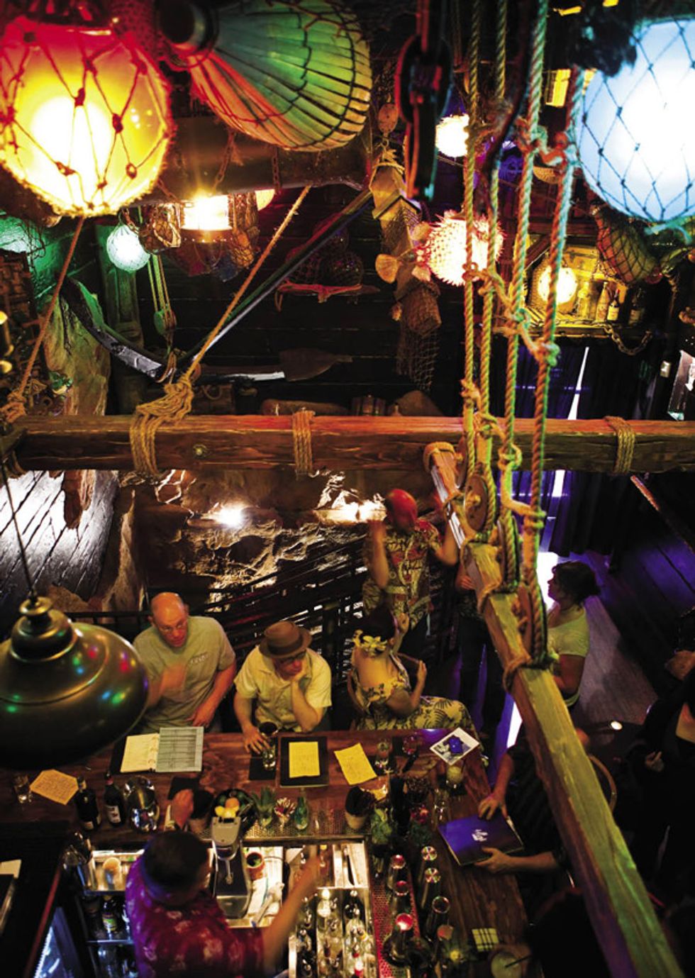 Look for: indoor waterfalls, coconut bowls, rum, drinks on fire, flower garnishes