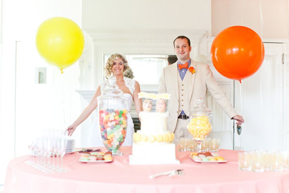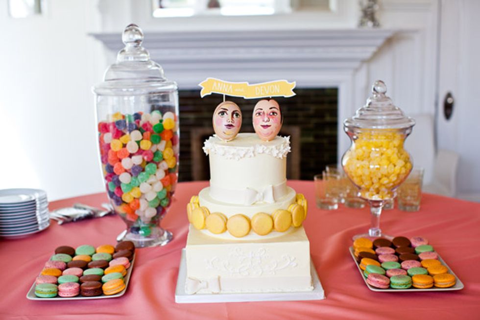 After four hours of karaoke, including Devon's rendition of Meatloaf's I Would Do Anything For Love, the couple cut the cake. Outside of some oversize yellow and orange balloons, the couple didn't decorate much. In most cases, they let the surroundings speak for themselves. “The one thing I was hung up on was the cake table," says Anna. “My cake was from Cake Coquette, and it was topped with goose eggs my friend Dawn Gately painted.