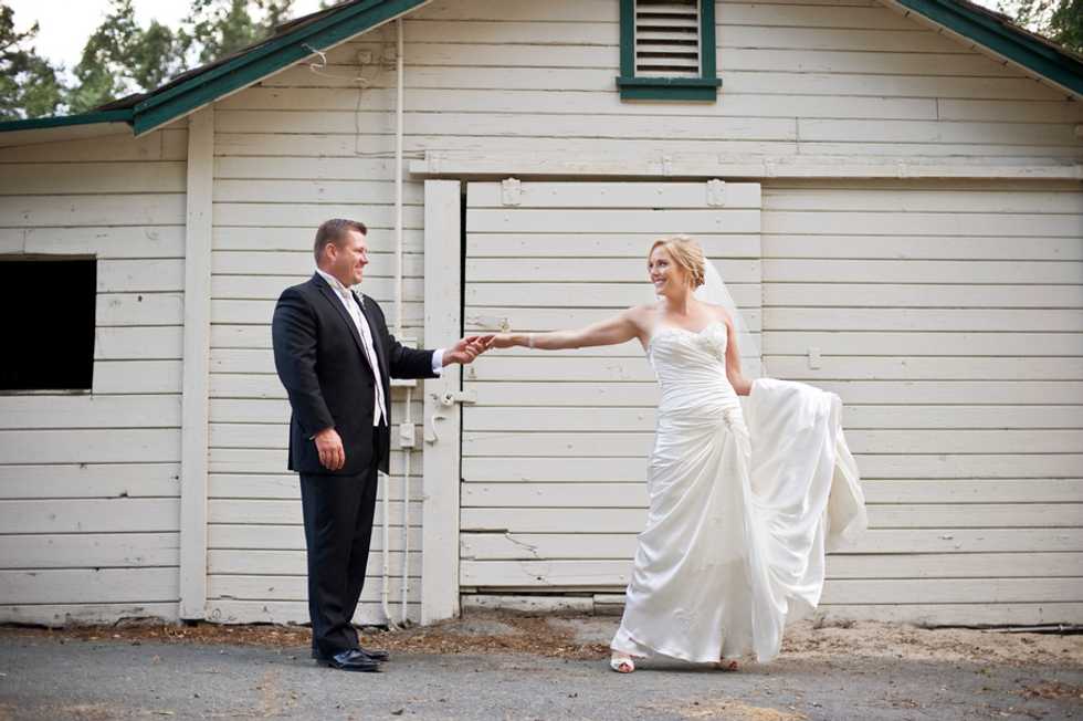 A giant oak tree shaded Rebecca, Colin and their guests during the ceremony and the greenery surrounding them added a soft elegance to their vows. The beautiful old white barns behind the park created a lovely backdrop for photos of the couple and their closest friends.