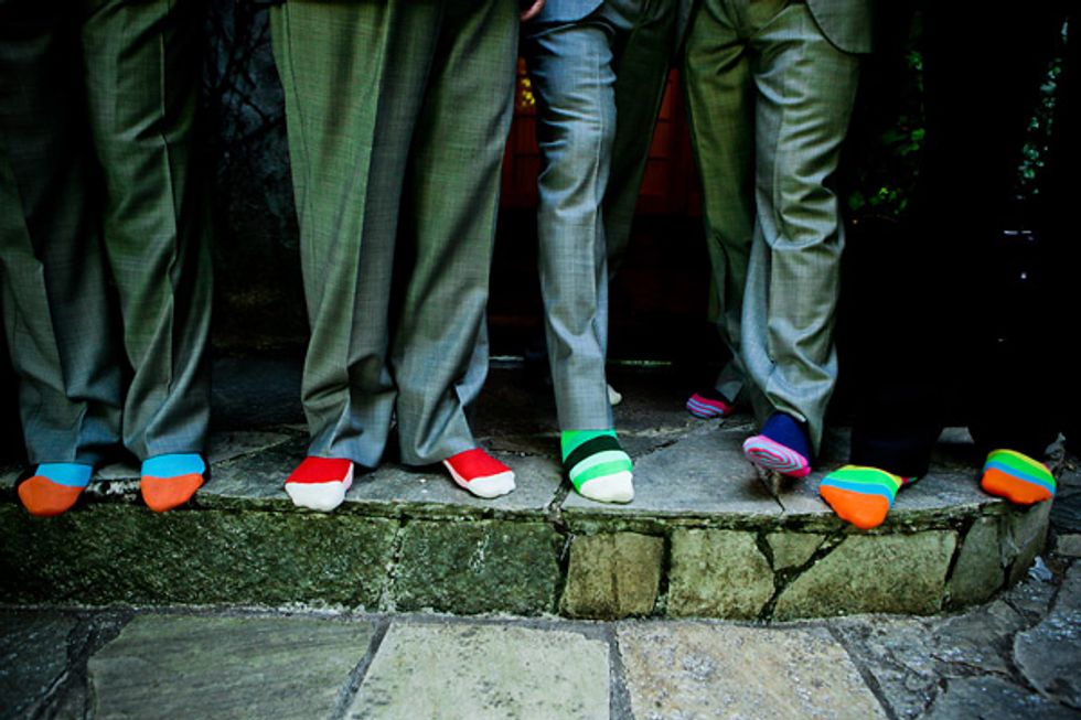 On the wedding day, the bride donned an elegant strapless gown and the groom dressed in a purple-lined tux he already owned, accessorized with neon-striped socks. “I bought all of the groomsmen Happy Socks,” says Malissa.