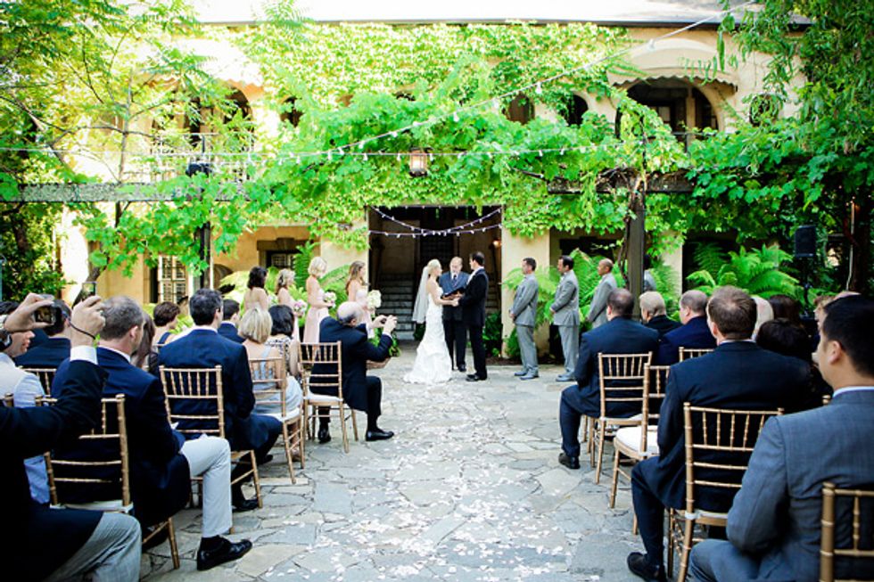 For the ceremony itself, the style was more reserved. The couple let the ivy-covered walls of the inn provide a decorated-by-nature backdrop. In a glamour in the wildness decorating move, the dinner tables were dressed in platinum and pink tones, a mirrored table runner, and crystal accessories.