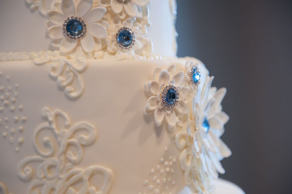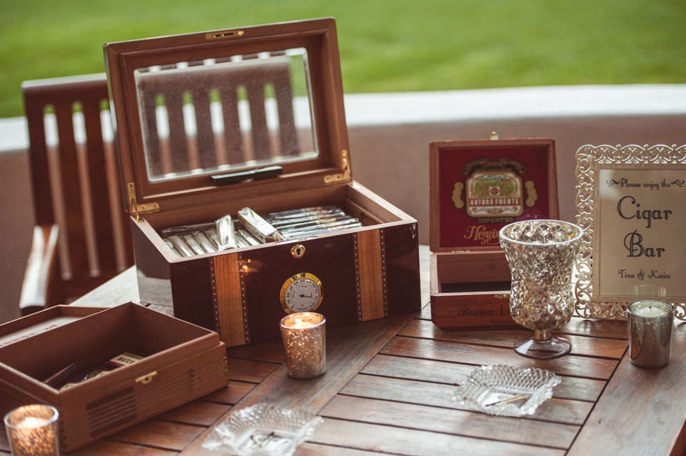 The bride ordered special gems for the cake decoration, and they ordered a genuine six pence penny for the groom to wear in his shoe. With the additions of a special "groom's cake" and cigar bar, this wedding was unique in a myriad of ways.