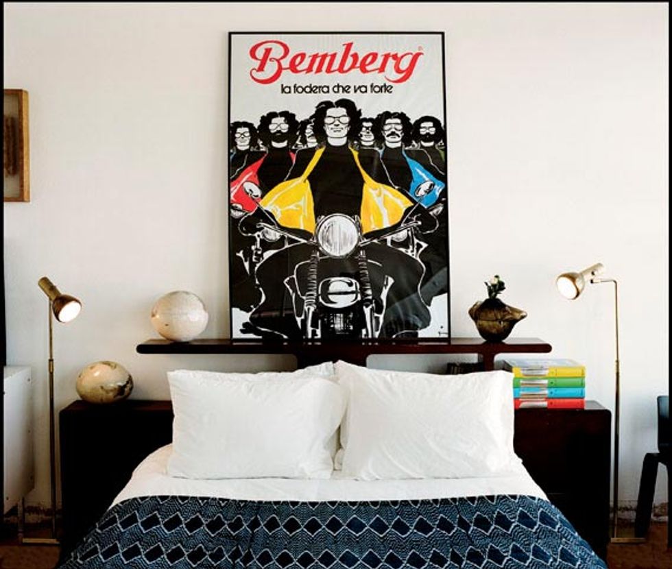 “My greatest joy is to exist with works that change the way I perceive art and design," says the SF native. To wit, the home's centerpiece is a large installation by Reno artist Katie Lewis, who created an amorphous map of her health concerns by clustering hordes of dress pins and thousands of tiny penciled-in dates—all on a 25-foot wall-cum-canvas. Its intricacy can be contemplated from various viewpoints, like the living room's leather sling chairs by Charles Pollock for Knoll with original, age-appropriately tattered cushions (“My cat, Fred, has spent a lot of time on them," says Racuk). Or the bedroom loft, where a sculptural wooden headboard from Mexico and a colorful late-career print by fashion illustrator René Gruau attempt to divert your interest.