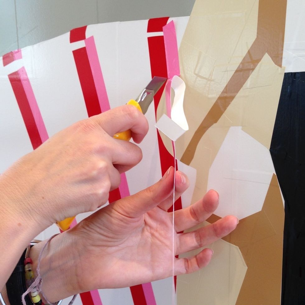 And it's true, the nature of their art is very participatory. The artists hand-cut the vinyl tape into strips of various sizes and then painstakingly apply them to found images that they project onto an all-white panel. Absolutely nothing is drawn or painted; every image is made with only adhesive tape.