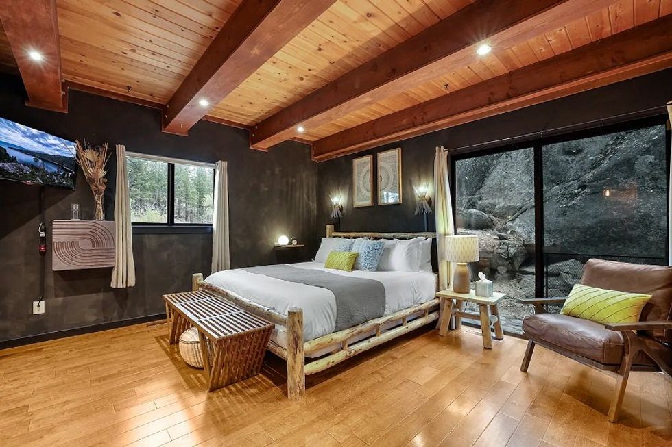 This Nordic-style Tahoe retreat is how to do Tahoe with a crew. The deceptively spacious, wood-paneled A-frame has room for eight spread across three cozy bedrooms on three levels. On the main floor, there’s a master bedroom, living room, and fully equipped chef’s kitchen with a hydroponic herb garden and an absinthe fountain; the adjacent patio is decked out with a barrel sauna, hot and cold plunge tubs, and gas grill. Additional boho-beautiful bedrooms and baths are located upstairs and down. WiFi, almost two dozen board games, a foosball table, and fireplace round out the lush amenities at this pet-friendly stay.
