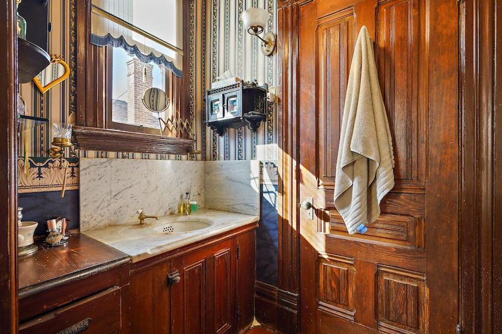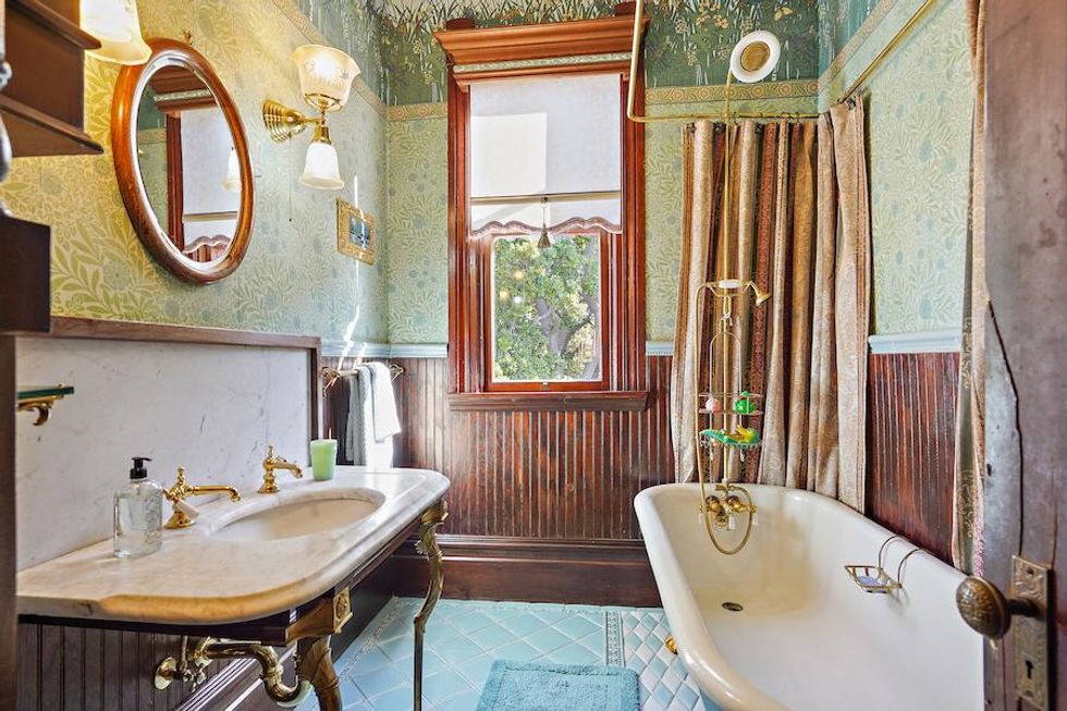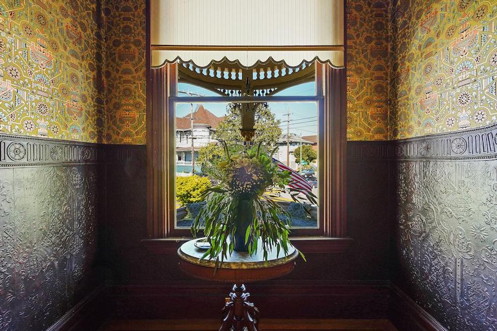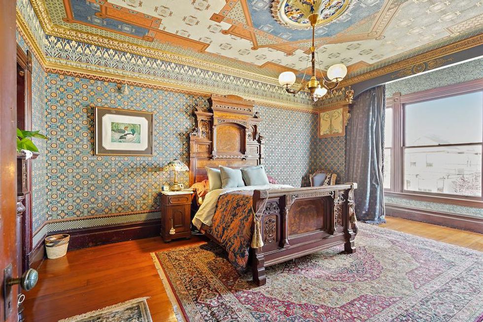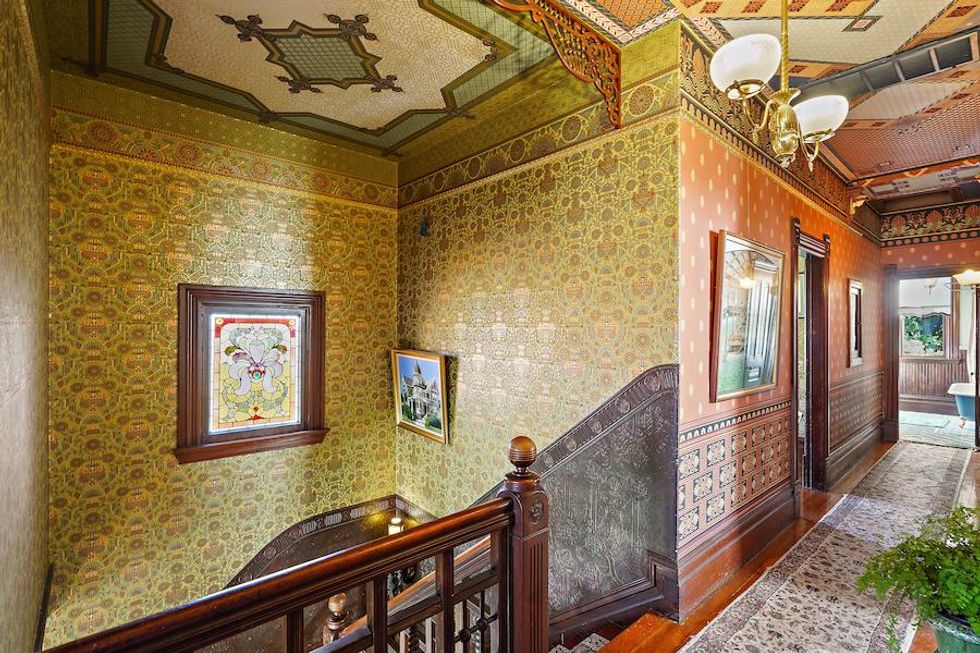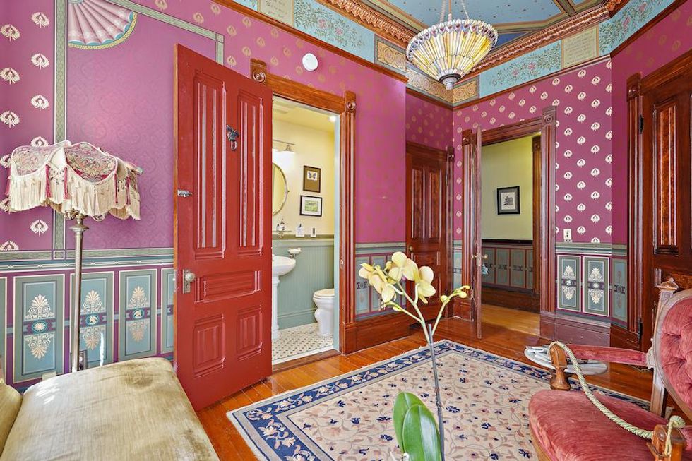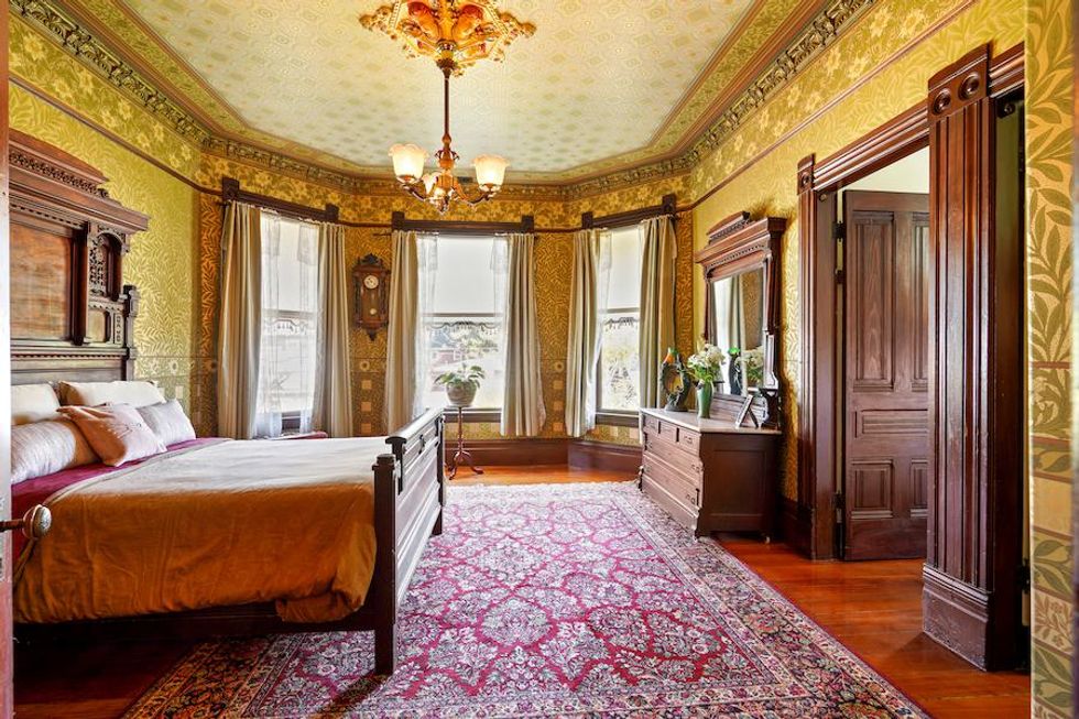 Back to the foyer and up the staircase, colored rays of light beam down through more stained glass. At the front of the house you'll find the fainting room, a 10-by-10 space where tightly clad ladies of the era could "have a moment," White said. It now makes for a perfect office. Next to it is a tiny porch that overlooks the witch's cap. And next to that is the primary suite.