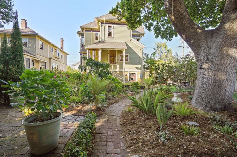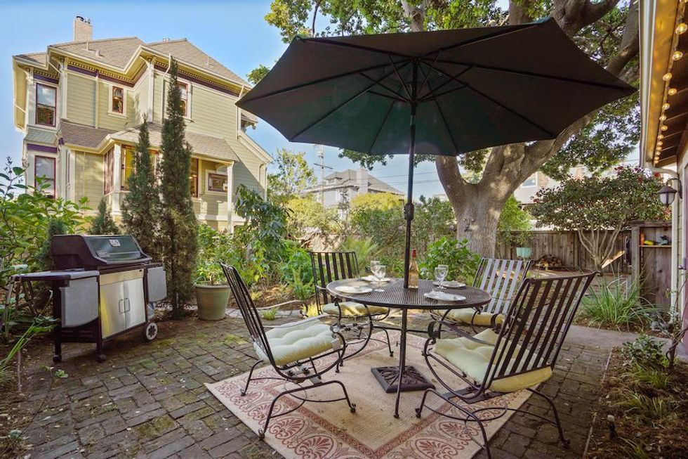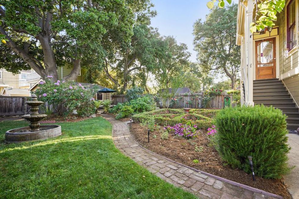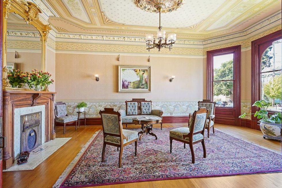 The parlor fireplace, originally coal, now wood-burning, has what looks like a gleaming brass insert but was called a "nightguard" to control the heat from the coal. The tall front windows look out to other Victorians, smaller cottages and bungalows in the lovely neighborhood, all just a quick walk to shopping at the Southshore Center and on down to Alameda's waterfront.