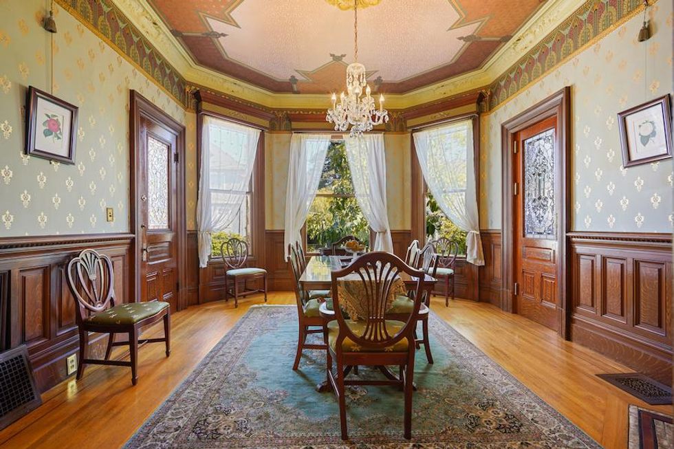 The dining room has more tall windows, gold-finished crown molding, sage-green wall coverings and glittering stained-glass windows. There's another fireplace, this one now gas, but with original tile depicting a hunting scene.