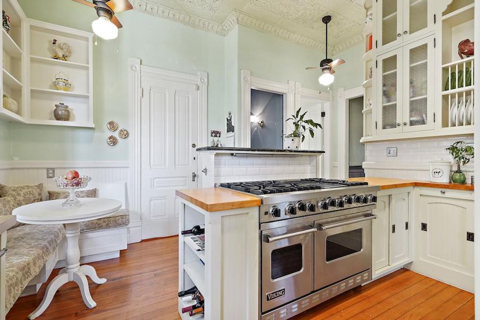 At the rear of the first level is the pale-green, tin-ceilinged kitchen that seems sunny even on a cloudy day. They've kept the vintage feel with a corner breakfast nook but reconfigured the fridge's location and stove for modern convenience.