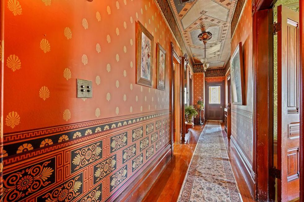 Over the next 14 years, the homeowners tenderly, painstakingly restored the home to its glory of yore, preserving original details like stained-glass windows and the lincrusta and anaglypta wall coverings along the stairwell. They've added crown moldings and ceiling medallions (hand-painted by White) and dressed every room, ceiling, hallway, nook and cranny with richly toned Bradbury & Bradbury wallpapers, making this showplace a walk-through work of art.