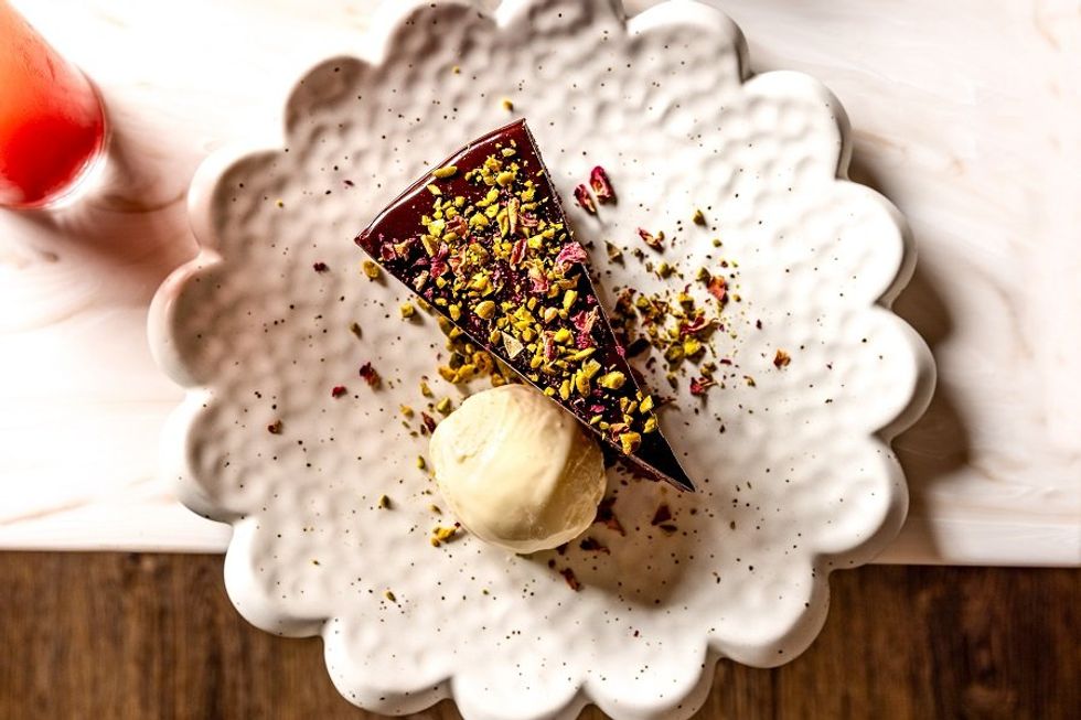 For the dessert I have not saved room for but still cannot resist, I waffle between Hill’s burnt honey and carrot marmalade Basque cheesecake and the chocolate cake for two, a sky-high slice of spiced, layered chocolate topped with a confetti of pistachio and rose petals. It’s the scoop of cream cheese ice cream served with the latter that tips the dish slightly in my favor. Though I’m not really a chocolate cake kind of girl, this one delivers the silky decadence it promises and I have zero regrets as I inhale more than my share, putting the exclamation mark on my meal’s final sentence.
