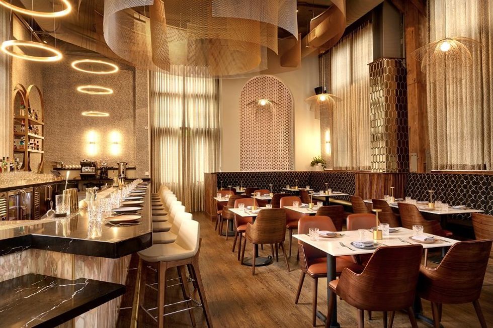 On the table, a riot of color and spice complements the swank decor. In addition to breads and dips—don’t skip chef de cuisine Kaili Hill’s sourdough focaccia—Alora’s menu of mezze, pastas, dishes from land and sea, and large plates span the coastal cuisine of the Mediterranean from Spain to the Levant. The restaurant’s array of cocktails, including the jammy Casa Della Nonna (rye, sweet vermouth, blackberry balsamic) and the briney and refreshing The Sea (gin, akvavit, sherry, rosemary, tarragon, tonic, and olives), lean into the same flavor profiles with aplomb. Though this first menu focuses more on the northern Mediterranean, as the restaurant matures, both kitchen and bar will venture farther into southern Mediterranean cuisine from the likes of Morocco, Algeria, and Egypt.
