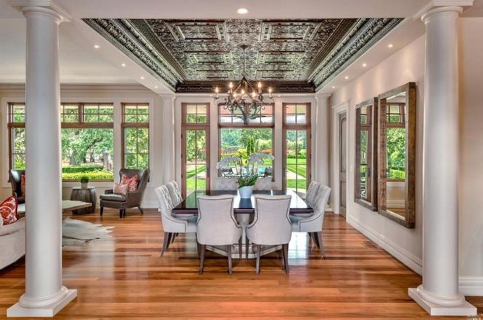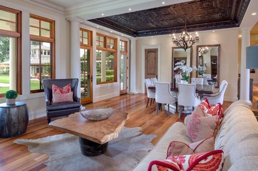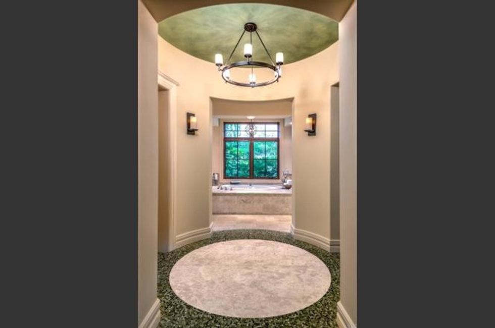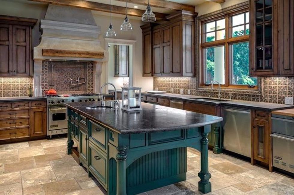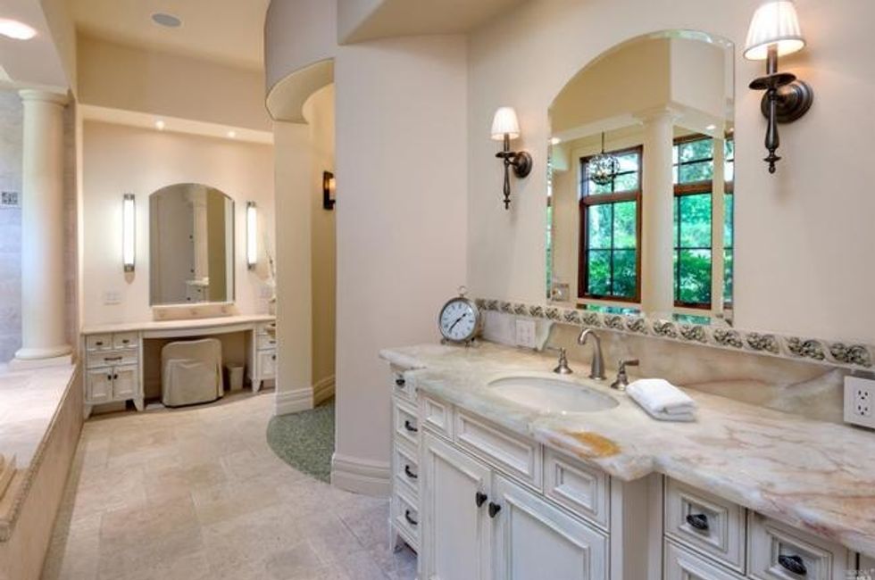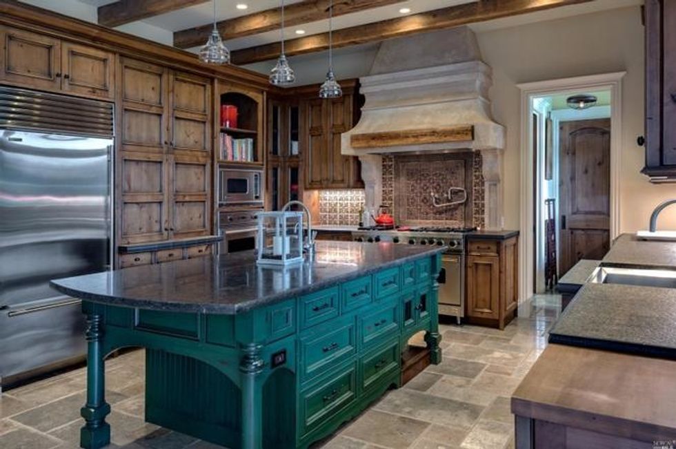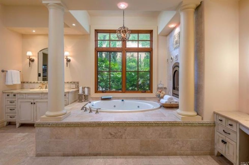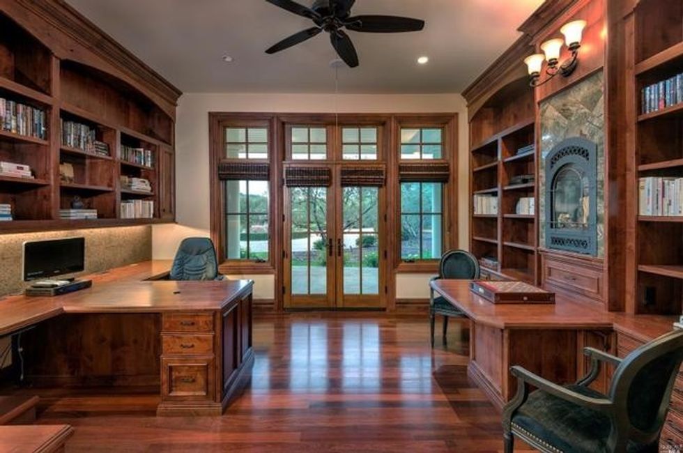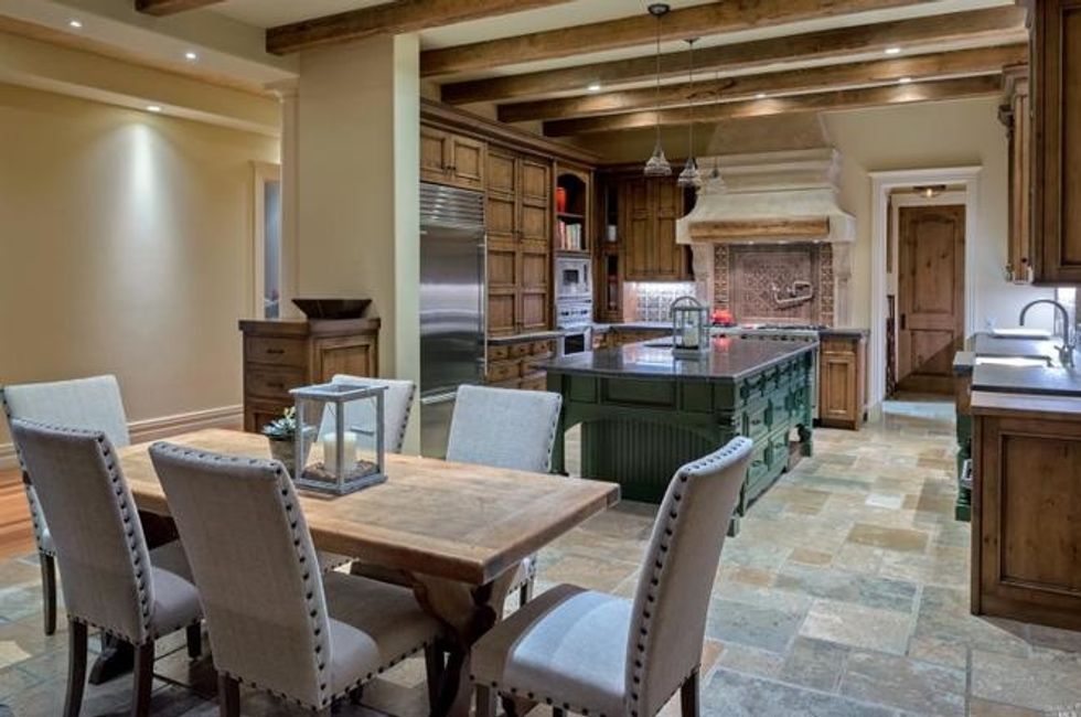 There are design-y accents and creature comforts throughout. Find stone flooring and countertops and a tiled backspalsh in the rustic-chic kitchen. The more formal dining has an ornate ceiling and chandelier; this room opens onto the living spaces with multiple fireplaces and a study.