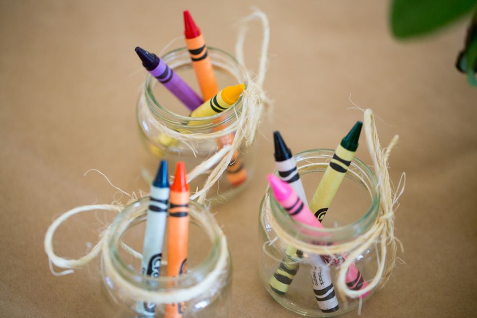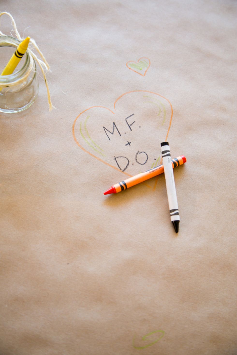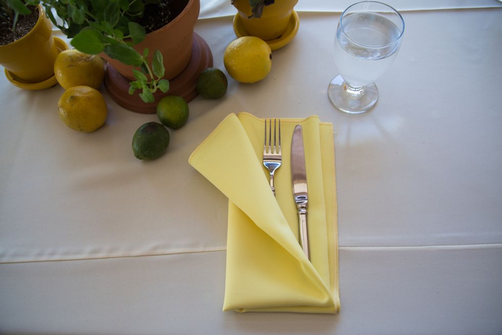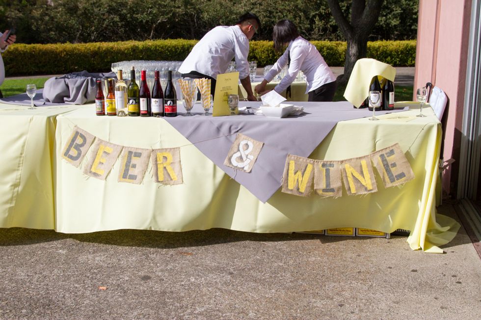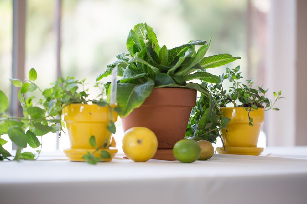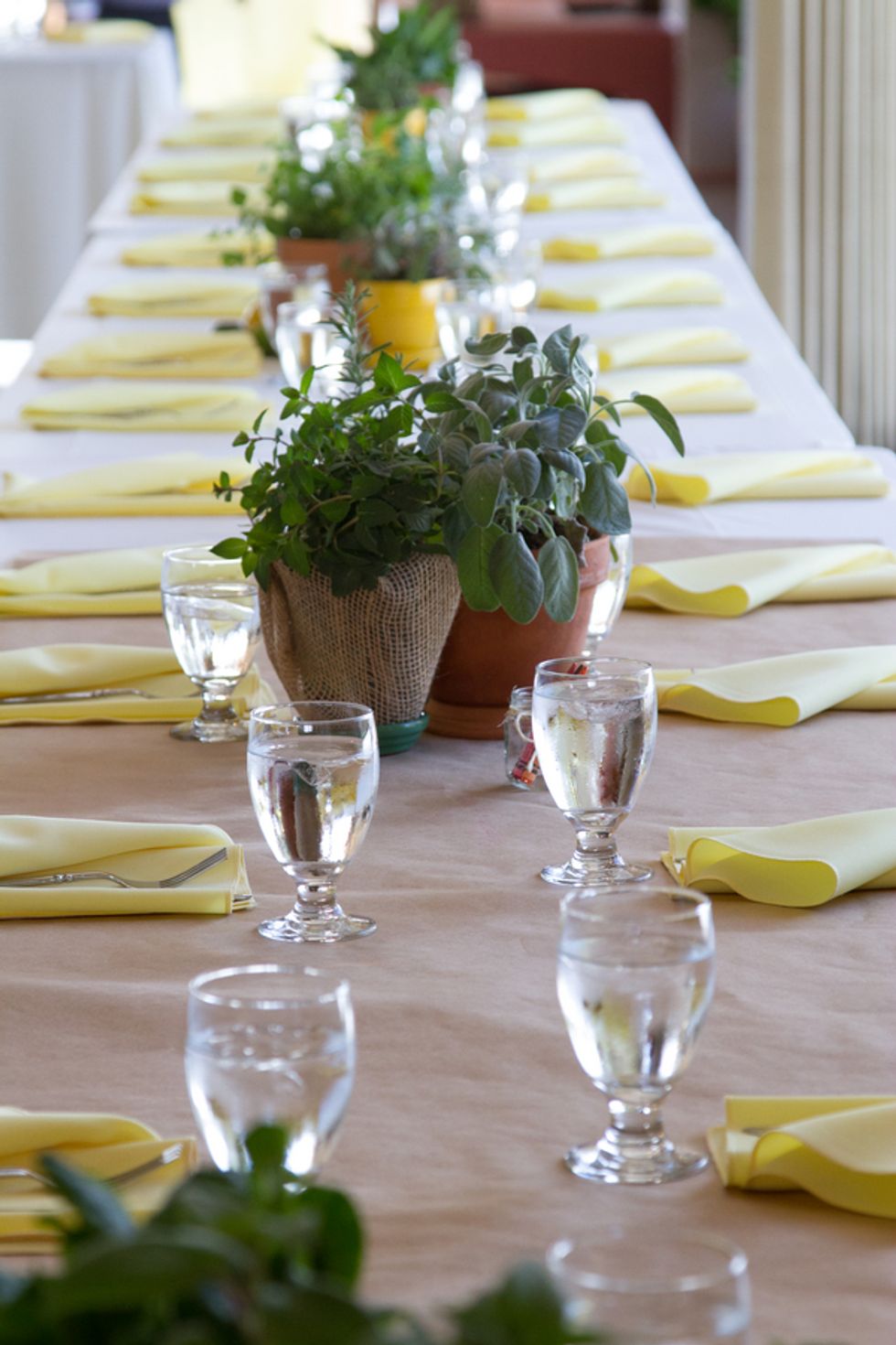 The reception began and everything was a special detail. Center pieces were potted herbs, which partygoers were encouraged to take home. Hand-painted burlap banners adorned the room, along with live lime trees and various green and yellow flowering plants. Guests were encouraged to write on the Kraft paper table runners and taste the lemon and watermelon frescos that were being served.