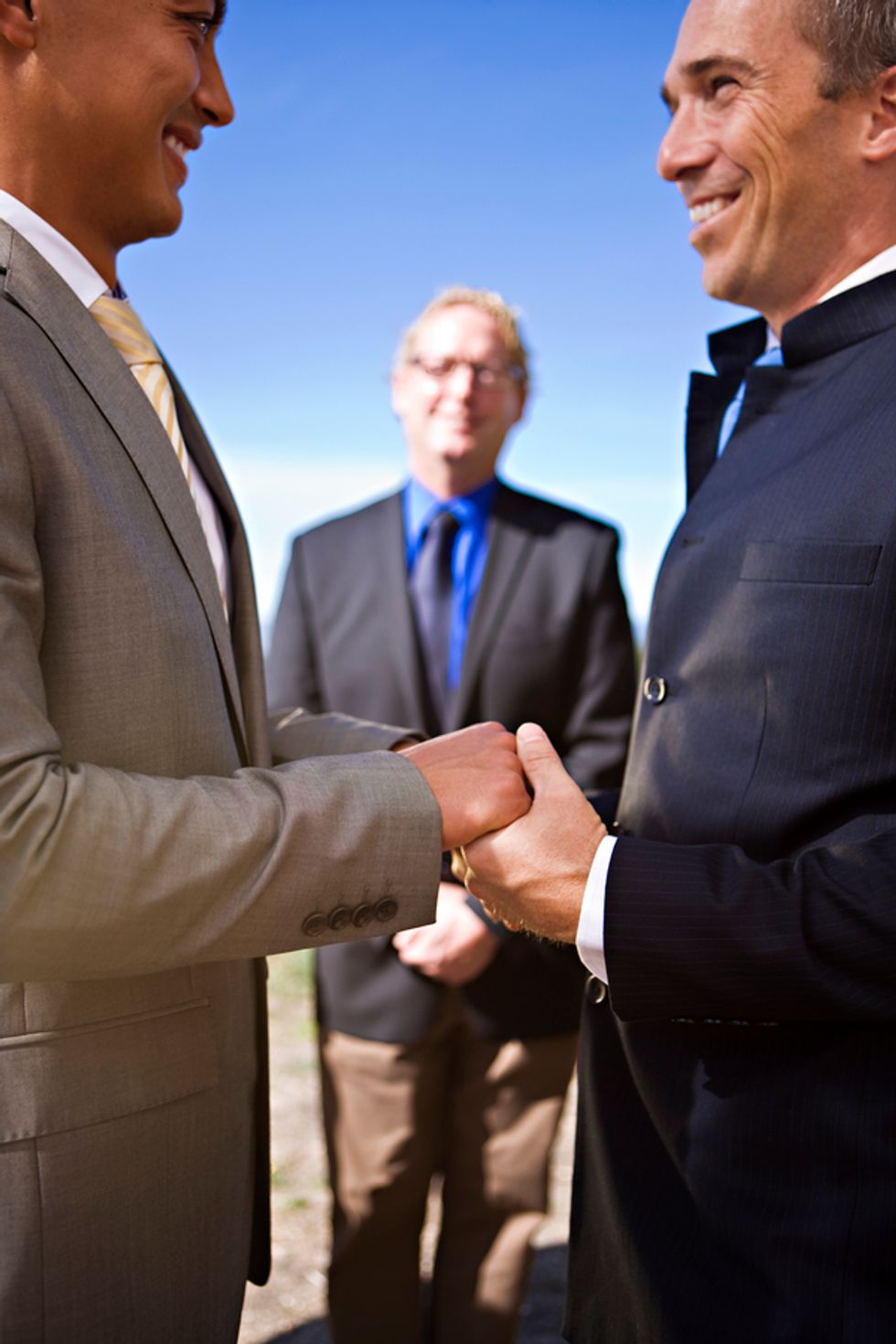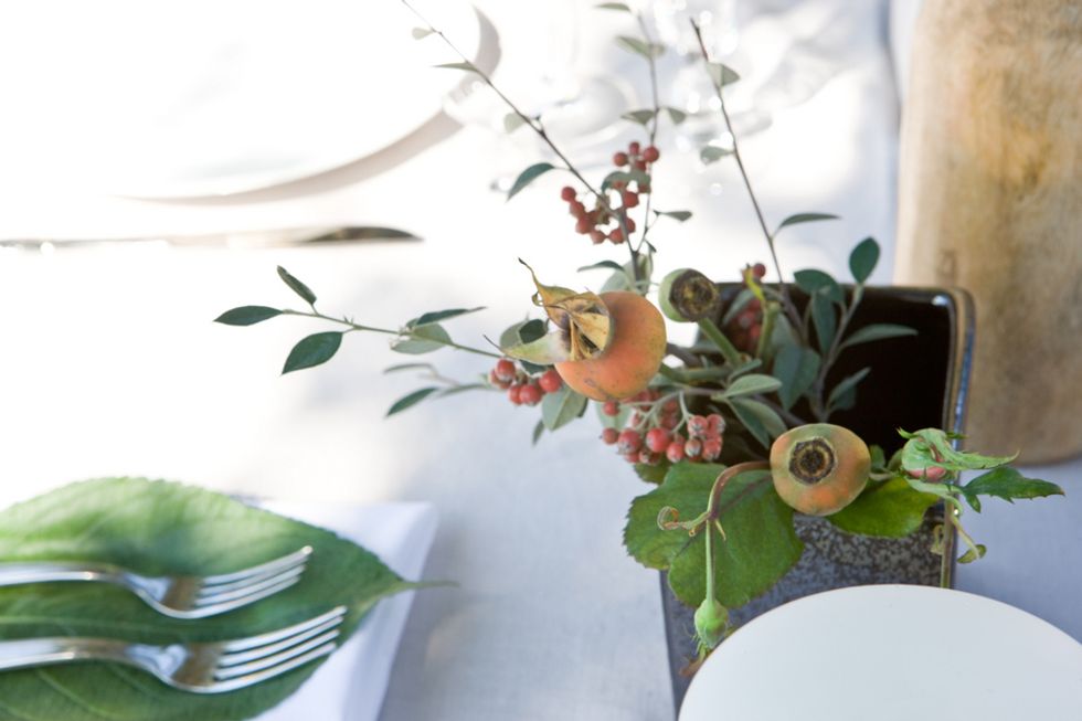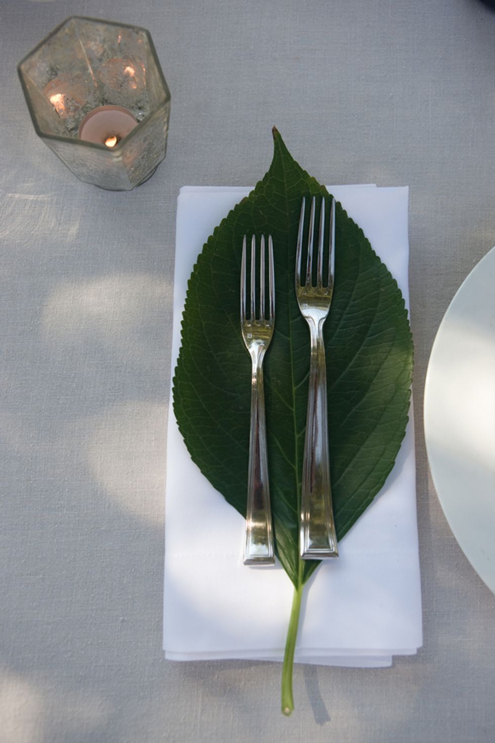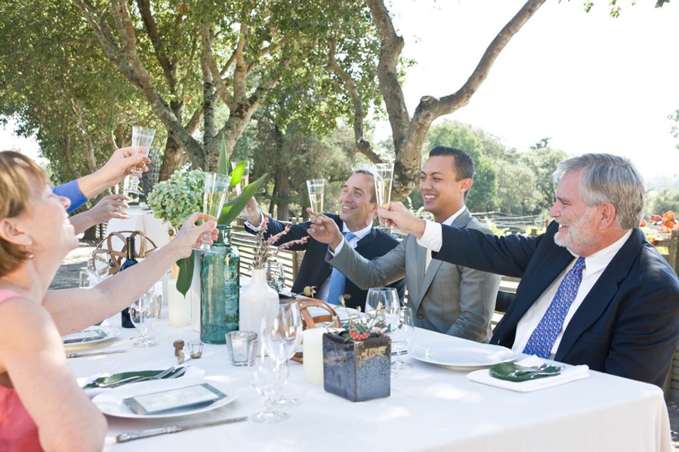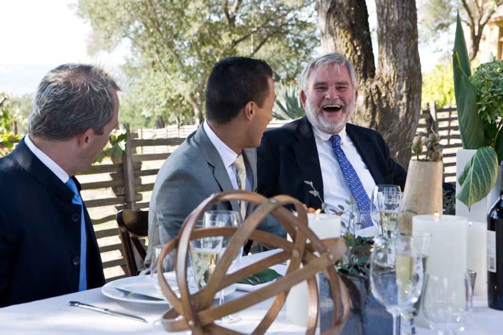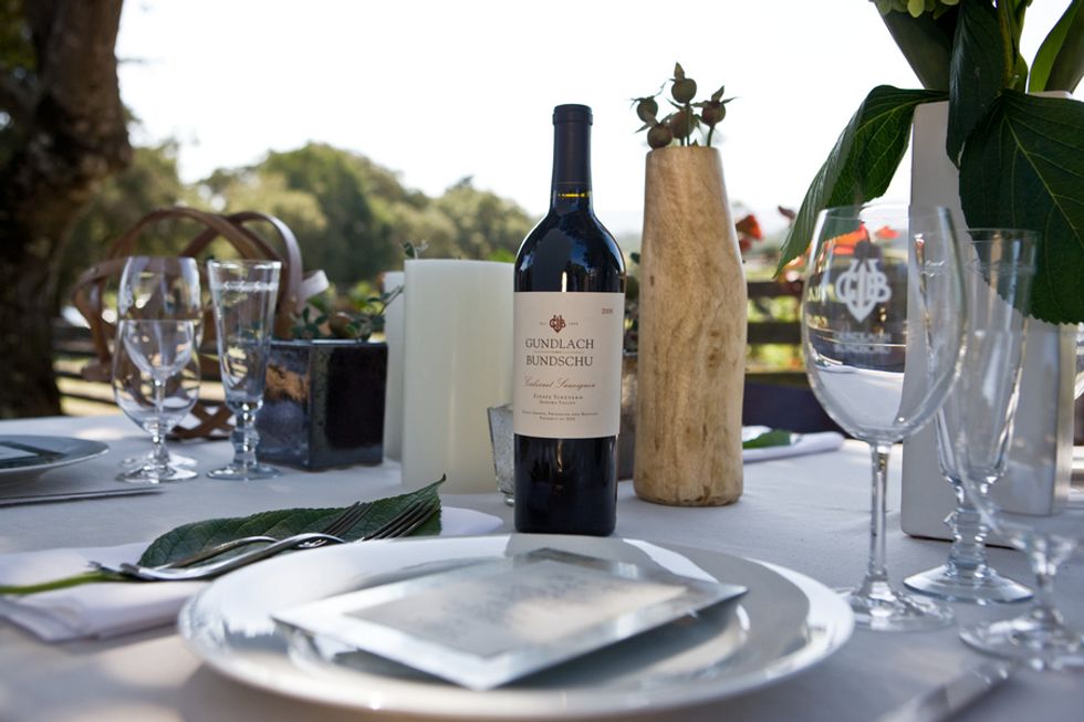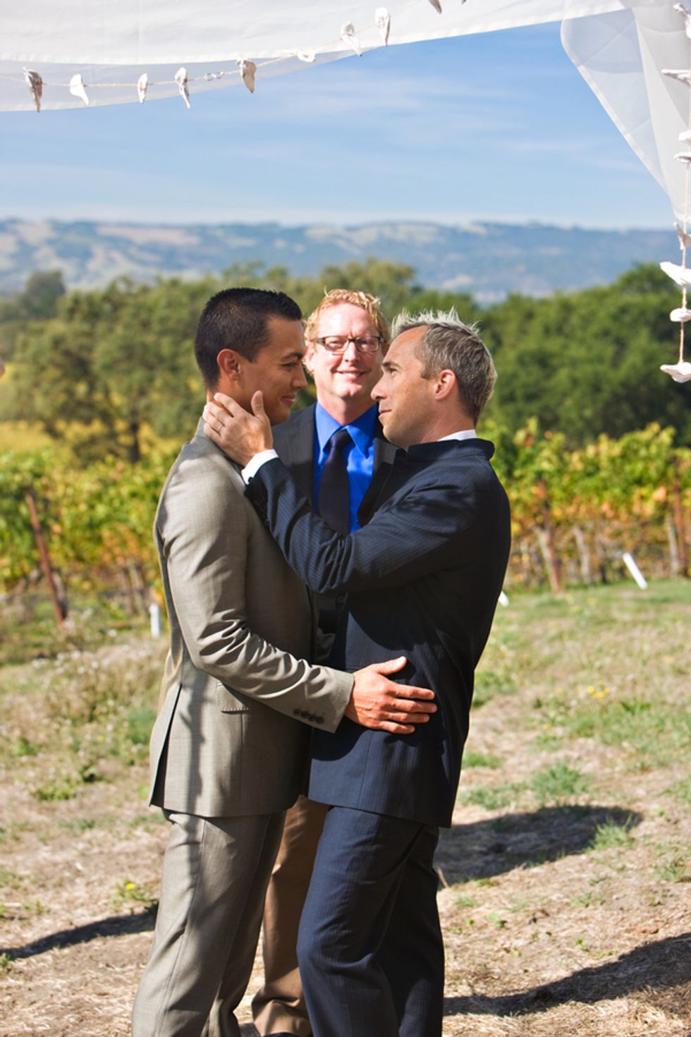 No florist was hired; instead, the guests strolled the vineyard in the early morning to find plants and trees they thought were interesting. "Nothing that can't be put in the local compost" was the rule. In contrast, the menus on galvanized steel spoke to the contemporary side of both grooms -- a juxtaposition between the organic and the crafted. Hydrangea leaves adorned the table under the contemporary flatware. Cabernet grapes fresh off the vine were scattered about, soft wood tones, neutral color palettes, and a touch of vintage glassware resonated the fantastic setting that included an architectural gem not often seen by visitors to the winery.