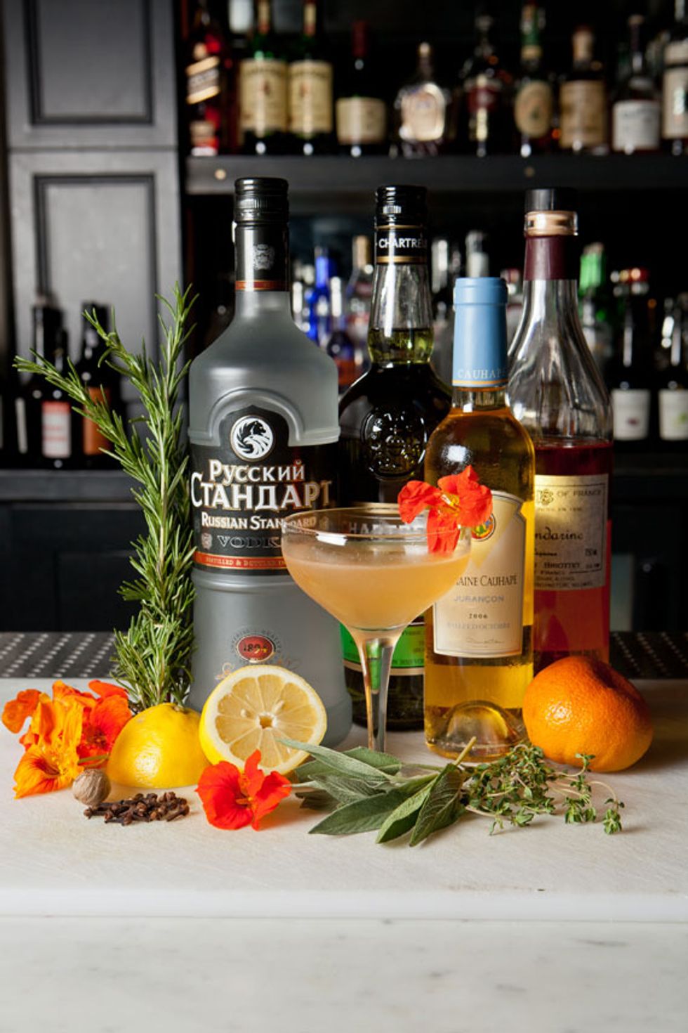 Bartender's notes: I was inspired to create the "Alpine Meadow" from the ideas of duality and change. I very much enjoy spring snowboarding and would love to do so in the Alps. Riding at that time allows one to experience the dual sensations of the floral spring air combined with the crisp cold of the snow. This cocktail enjoys the same qualities, going from bright acidic citrus when chilled to the earthier tones of truffle and sarsaparilla as the drink warms. The Russian Standard Vodka acts as the medium for those changes by providing the silky mouthfeel much like the mountain provides the platform for one the most enjoyable activities on the planet.