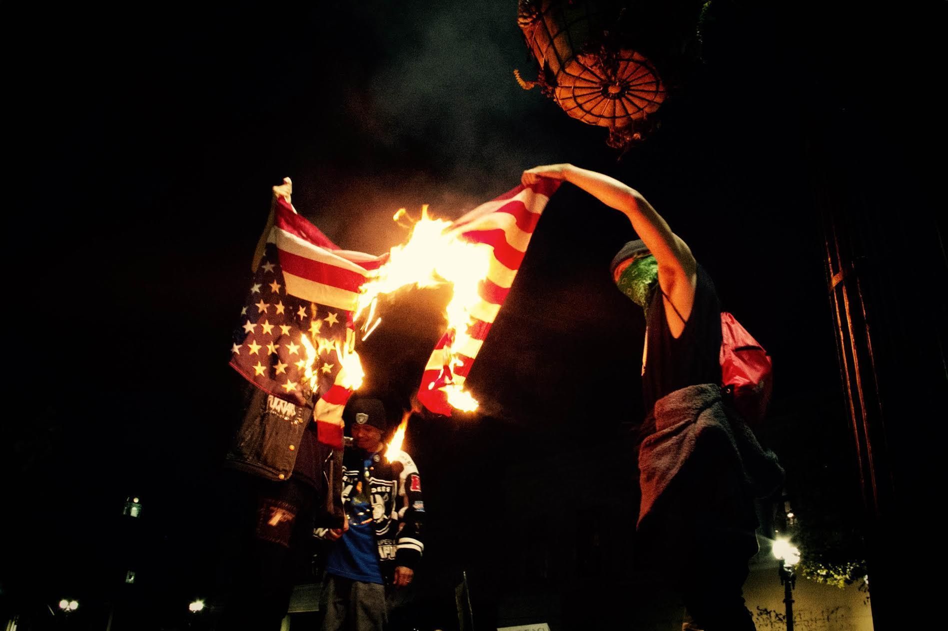 Anit-Trump protestors in Oakland set an American flag on fire. (Cirrus Wood)