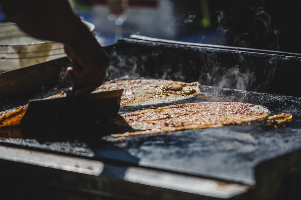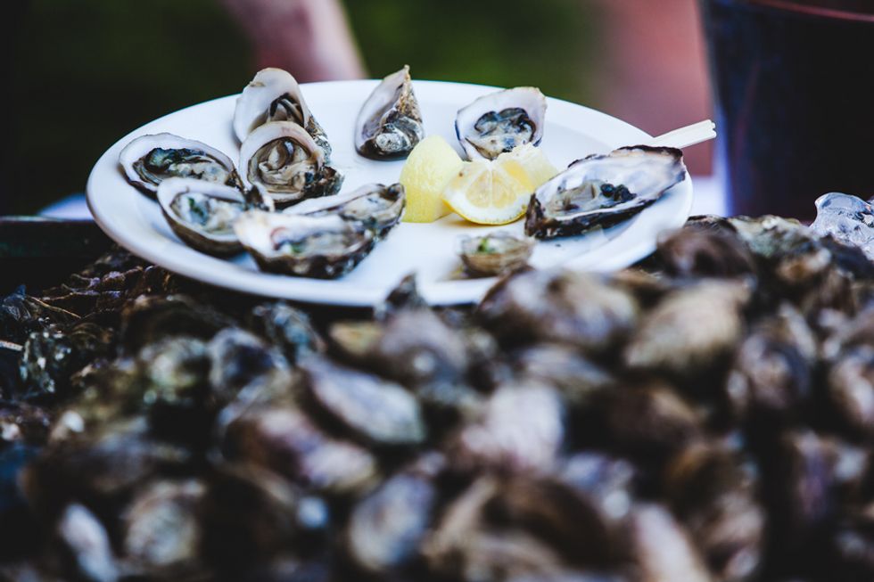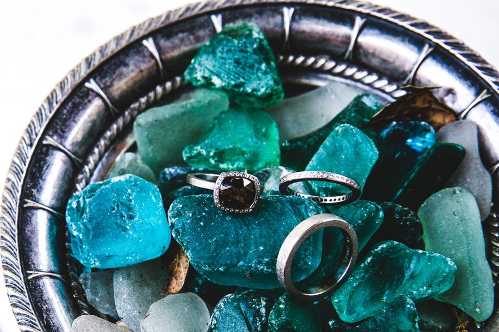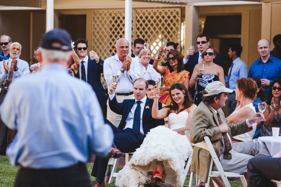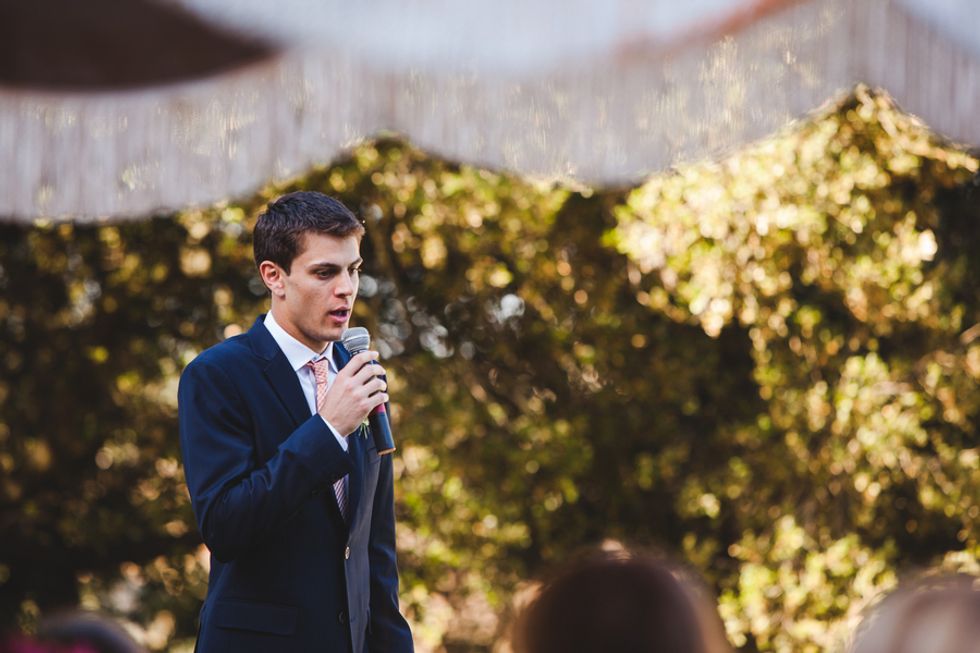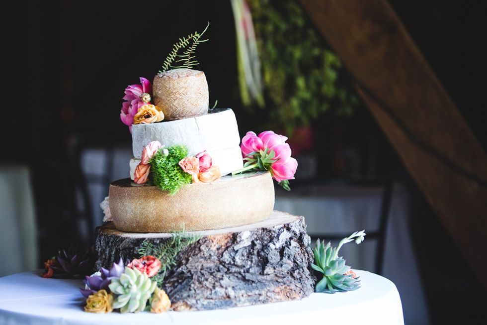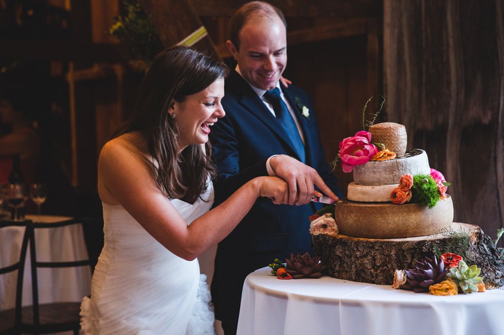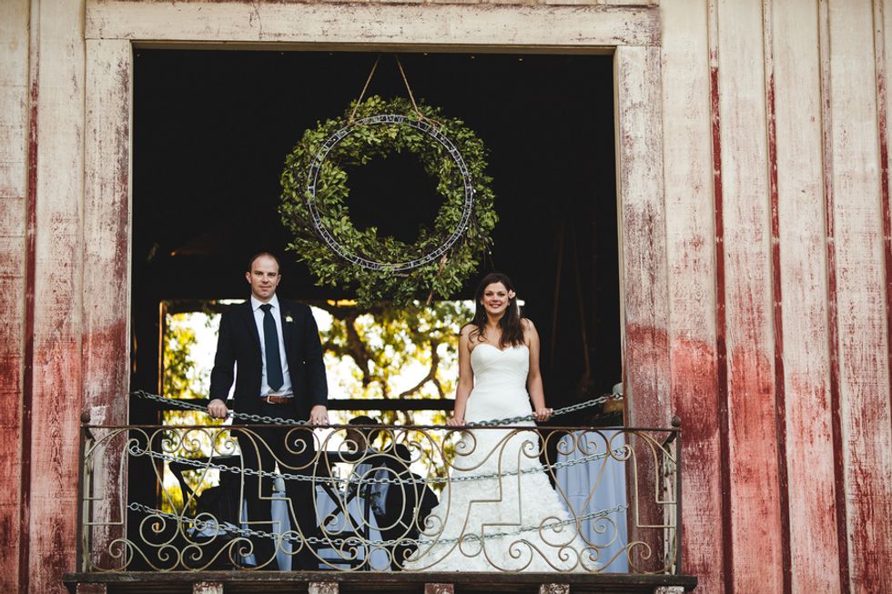 The perfectly groomed lawns and a bright blue pool provided a pleasant contrast to the tall dry grasses and ancient oaks. Wild flowers in mason jars, stacks of cheese forming a makeshift wedding cake, and rusting statues scattered around the property came together to form an unconventional wedding for the newlyweds.