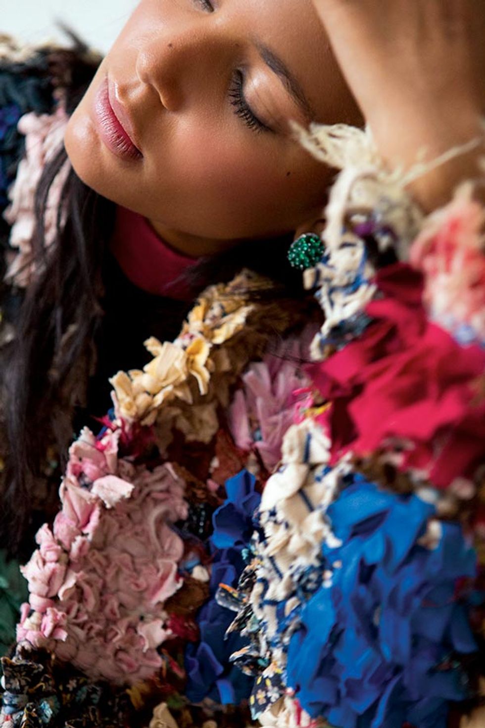 Xenomania Boucherouite bolero ($900); Saint Laurent by Hedi Slimane blouse; Graff round emerald Bombe earrings, price upon request.
