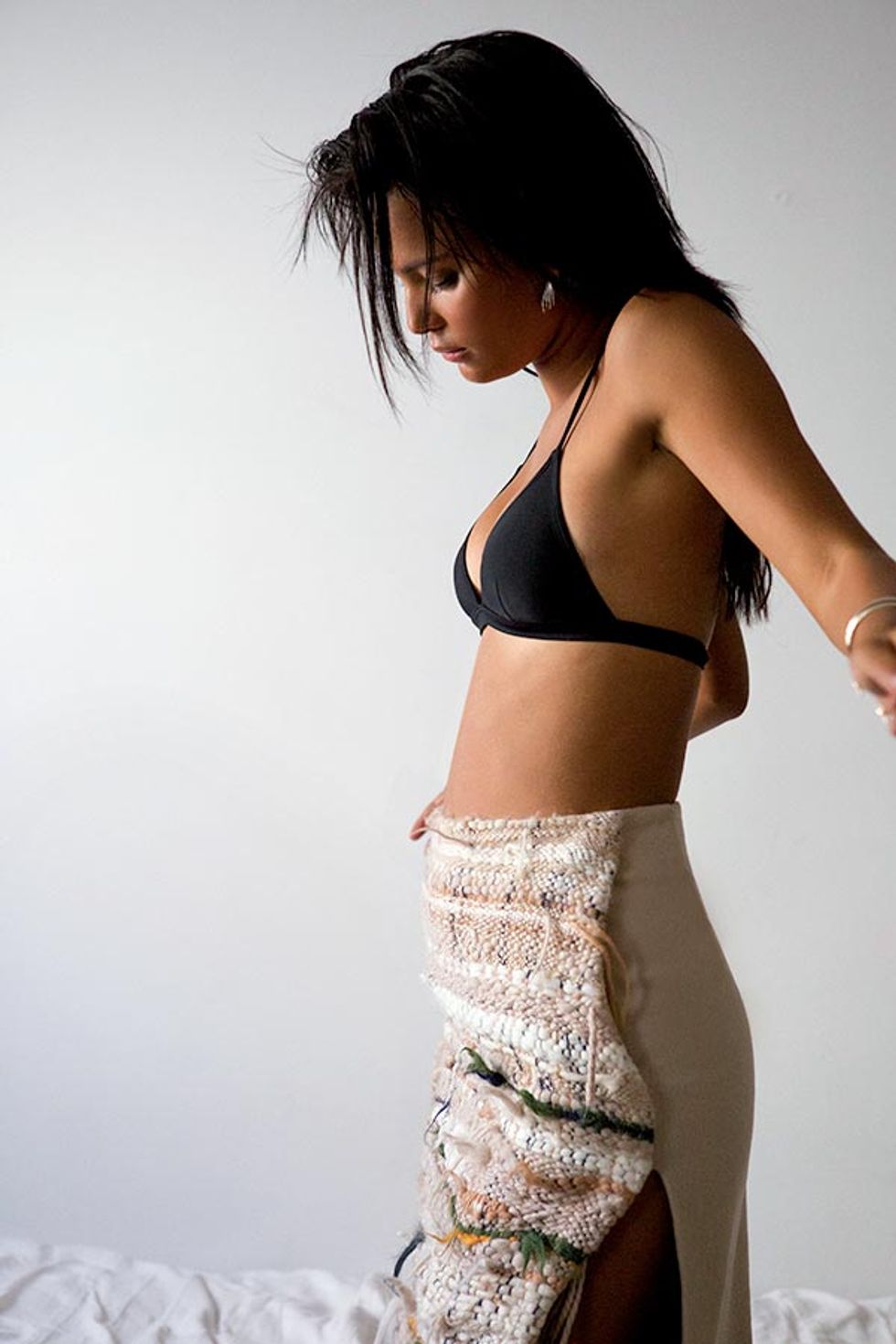 Altuzarra Beauvoir skirt ($1,195); Gabriella Kiss earrings; Anndra Neen Comet cuff; Alexander Wang swim top, stylist’s own.