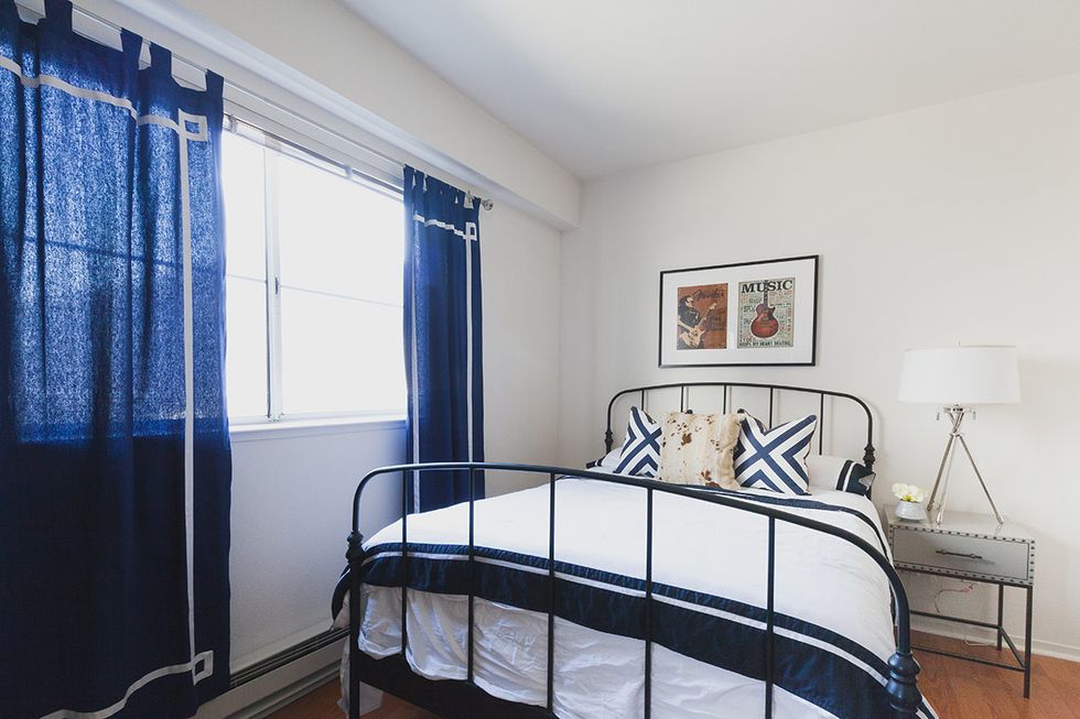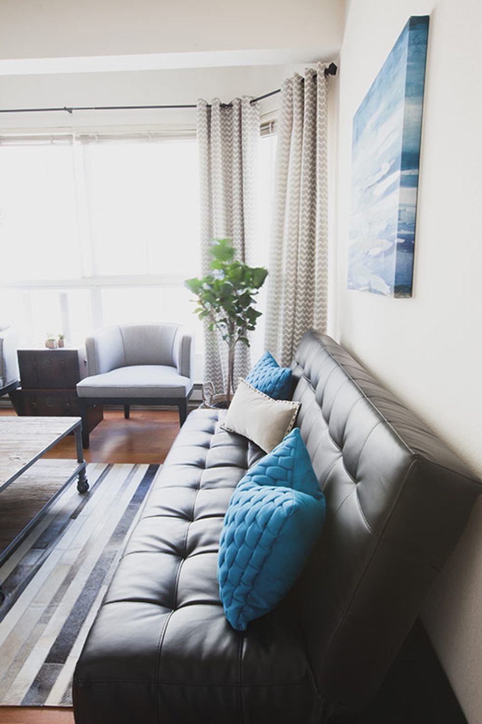 Homepolish designer Nina Jizhar added just the right amount of personality to make the space interesting while steering clear of too-designed-looking pitfalls. A tech guy, the client wanted greenery, furniture with natural details (like the coffee table), and to ditch the furniture he’d been moving around since college. An area rug made of leather strips adds cool texture to the living room, and every furnishing is timeless and cohesive. Click through to revel in the glory that is a single man’s well-designed studio apartment.