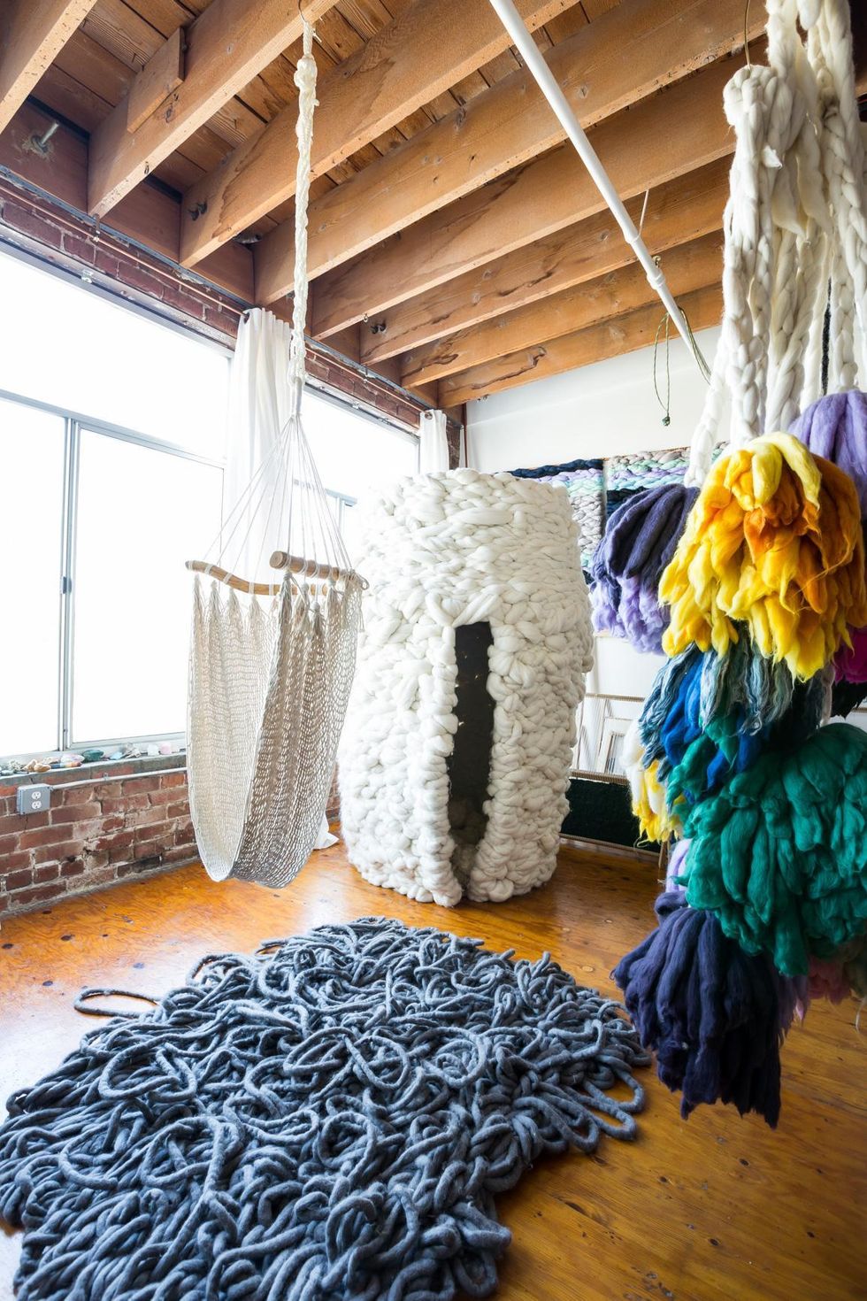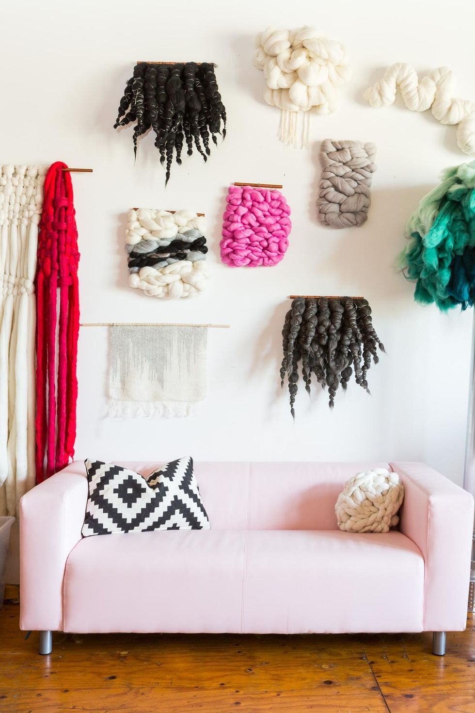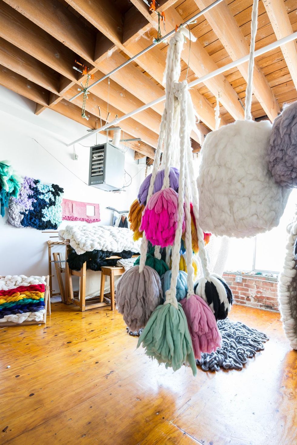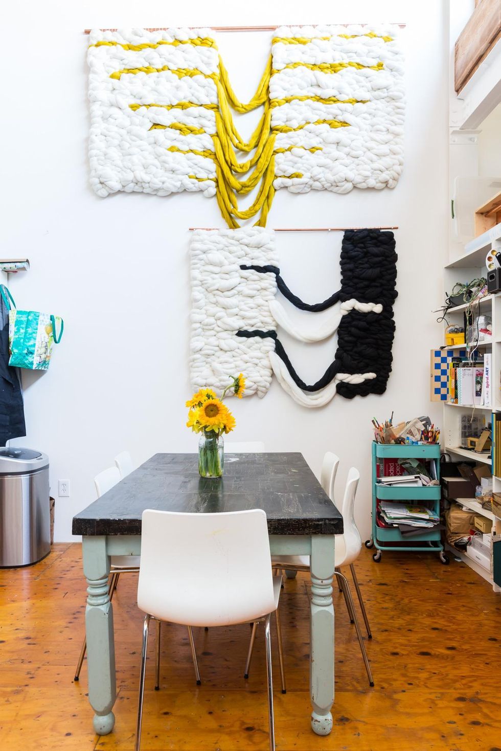 Shimek's home comes together with just as much intention. As a live/work loft, she moved in with a big, open canvas. She shares the space with her five-year-old son, so the space is segmented into smaller "rooms" to give some privacy for them both. She takes the front half of the loft where she does all her work and sleeps, tucked away in her cozy tufts of colorful work and materials. The middle area is their shared space with a kitchen, dining area and living room. The upstairs loft belongs to her son, which feels like an enchanted dream looking out over wooly works hanging around the house.