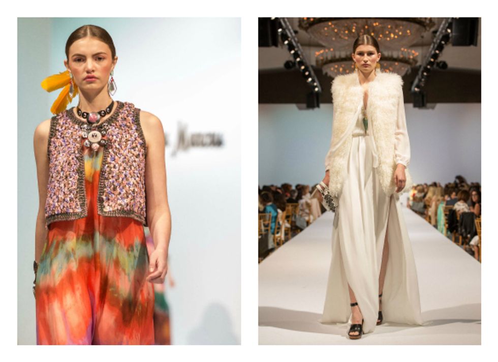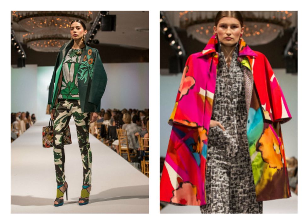 "What I love about fashion is that we invent the rules, and we break the rules," he said, as he presented unexpected looks such as a white leather motorocycle jacket for evening, a brown animal print scarf with a green evening gown, or (for guys) bleach-splattered denim with a luxurious velvet jacket.