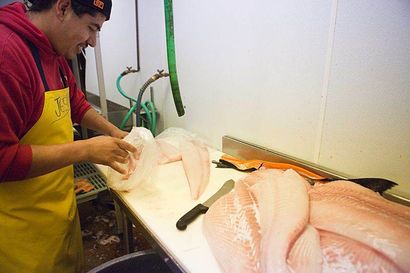 Mussels, squid, salmon and halibut are bagged, boxed and destined for Heirloom Cafe and Bar Agricole.