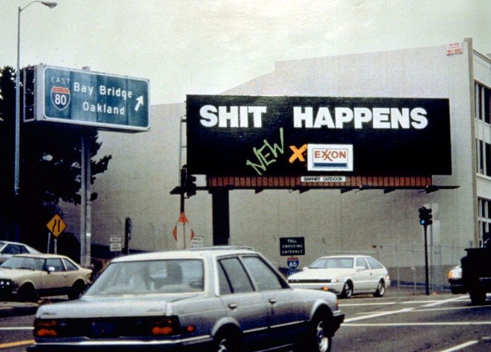 After Exxon apparently failed to take sufficient responsibility for dumping 11 million gallons of crude oil into Prince William Sound, San Francisco's Billboard Liberation Front decided to step in with an assist. A group of BLF pranksters changed the messages on two local billboards from "Hits Happen-New X-100" to the crude paraphrase of the oil company's explanation of the accident: "Shit Happens-New Exxon."