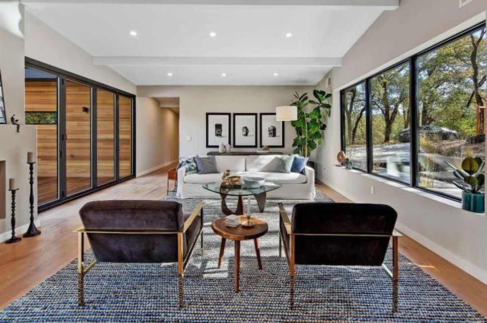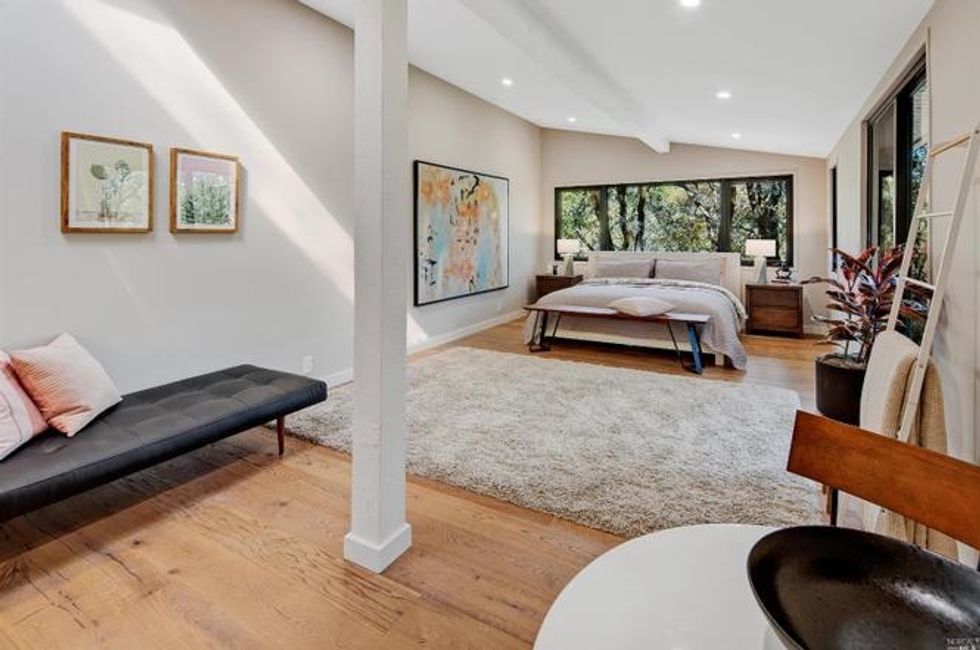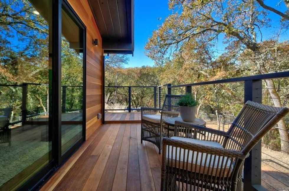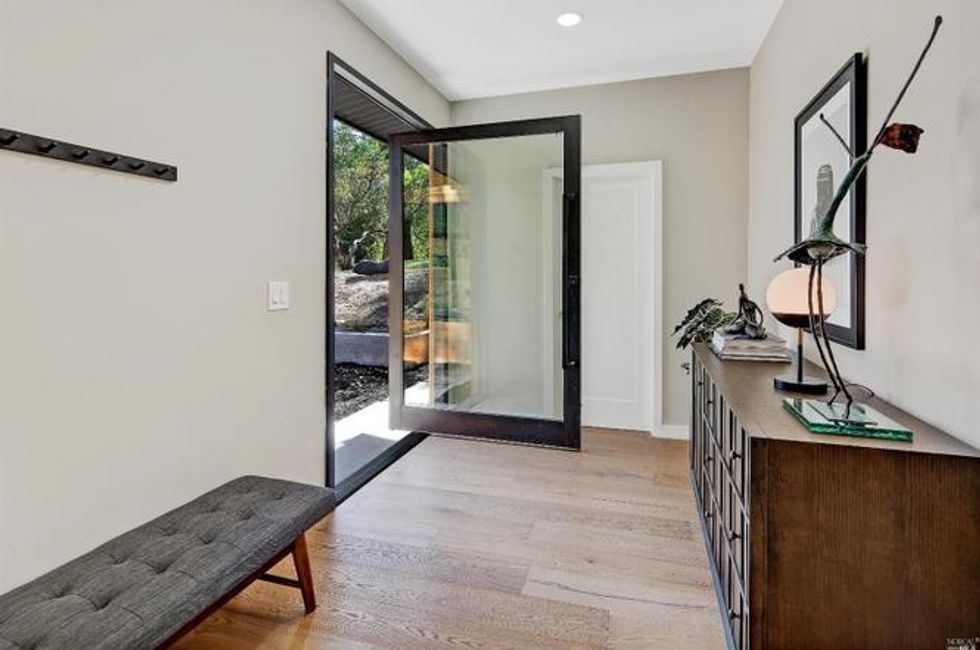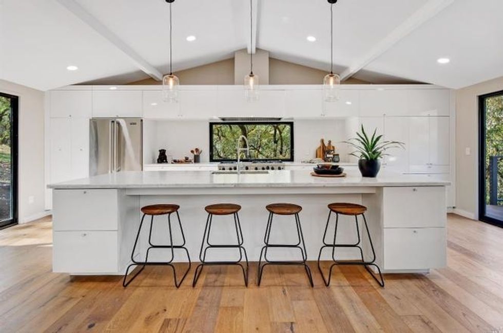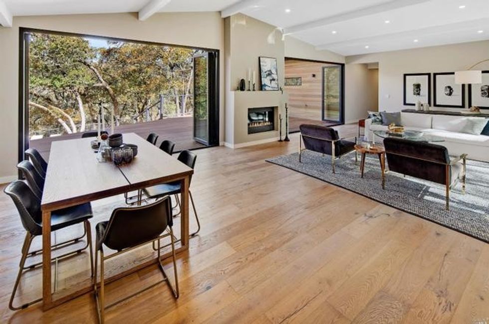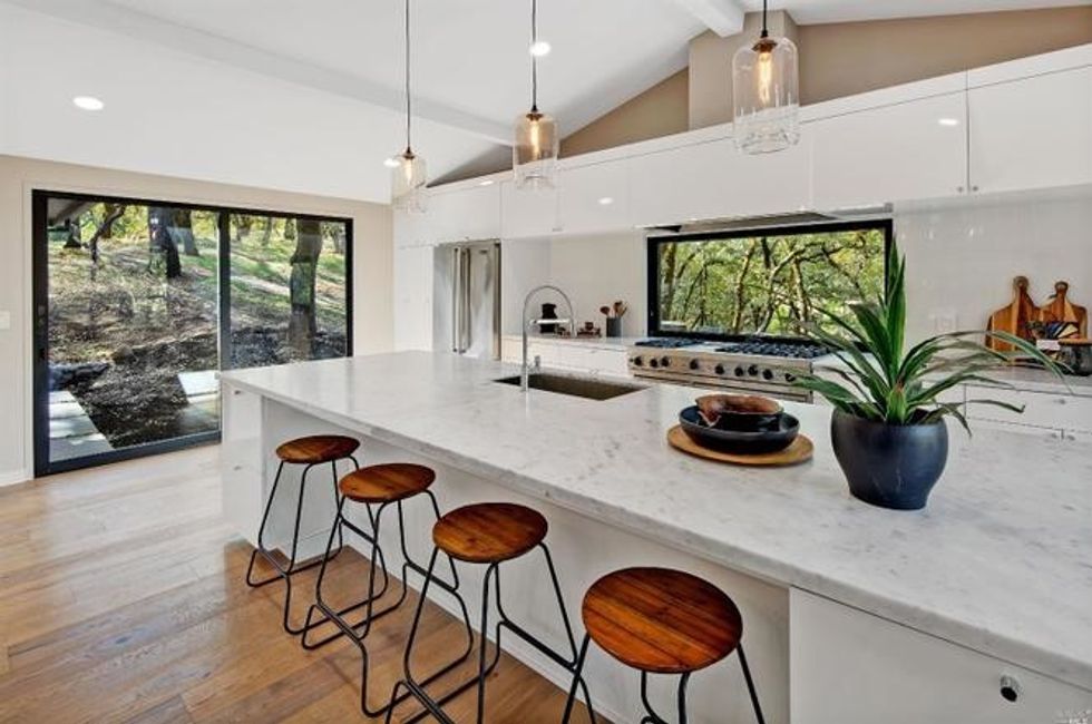 Inside, you'll find a gorgeous chef's kitchen with Carrara marble countertops, an oversized island with counter seating, Viking appliances, a butler's pantry, and copious amounts of wine storage—this is Sonoma after all. Soaked in natural light from glass walls on two sides and a kitchen window looking out into the trees, the space is an entertainer's dream.