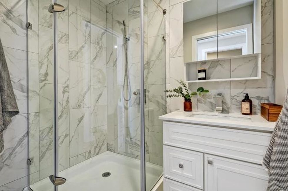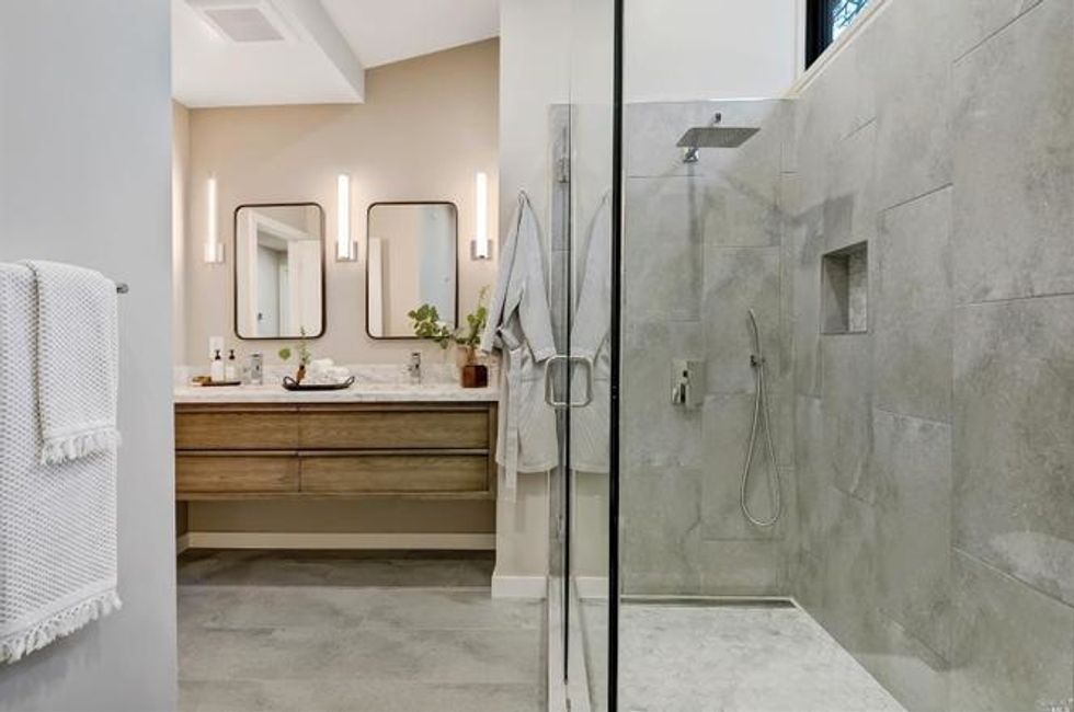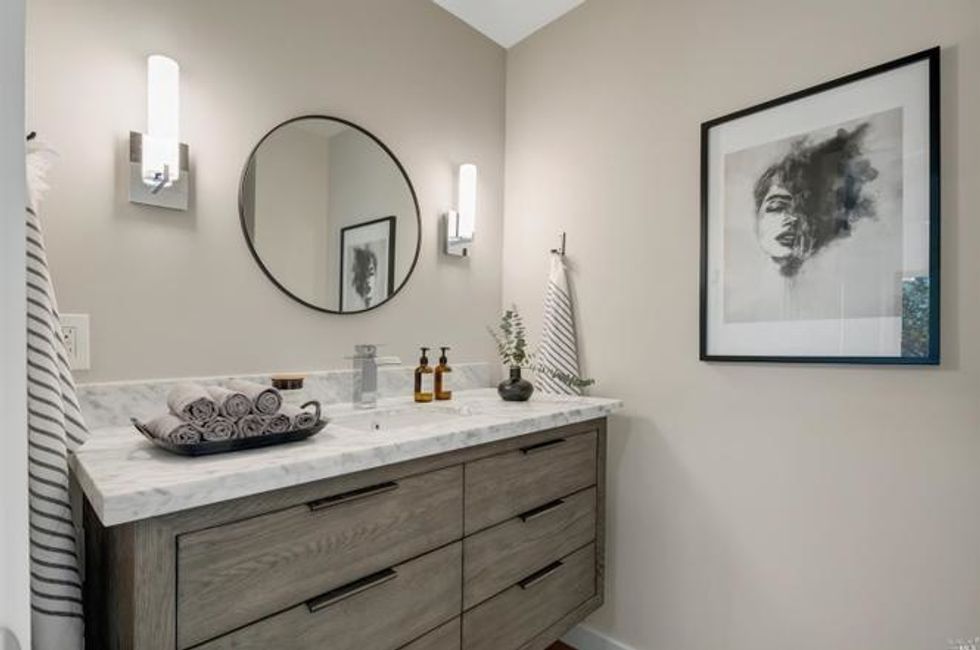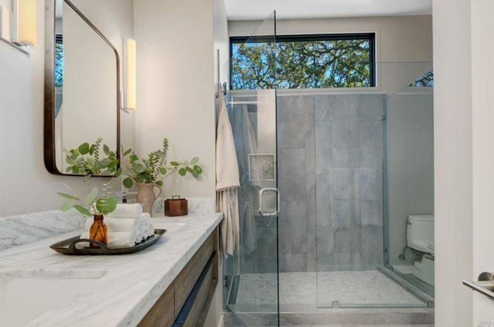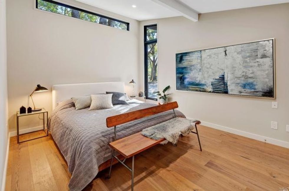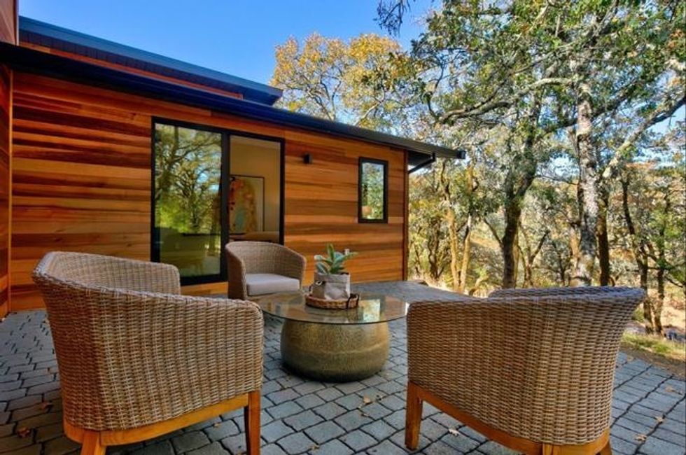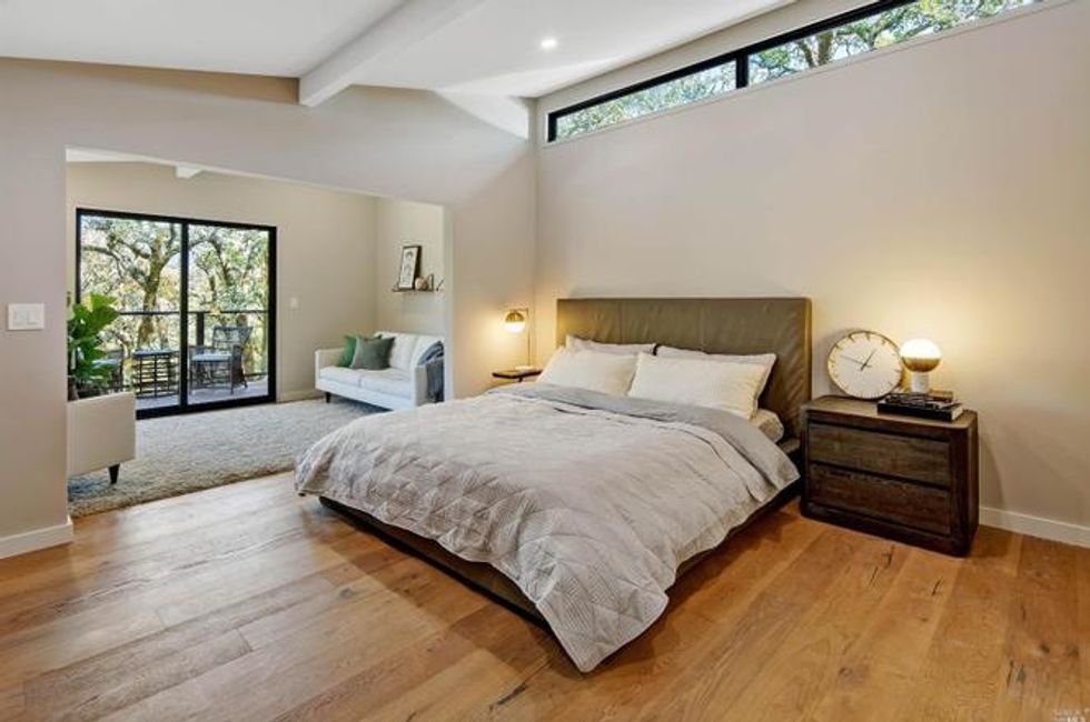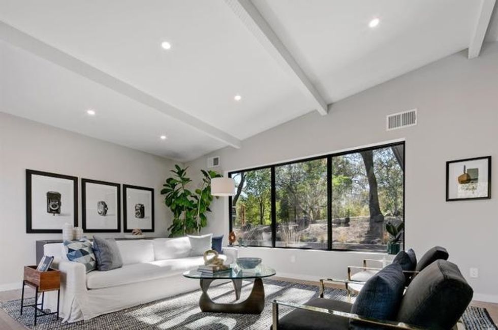Inside, you'll find a gorgeous chef's kitchen with Carrara marble countertops, an oversized island with counter seating, Viking appliances, a butler's pantry, and copious amounts of wine storage—this is Sonoma after all. Soaked in natural light from glass walls on two sides and a kitchen window looking out into the trees, the space is an entertainer's dream.