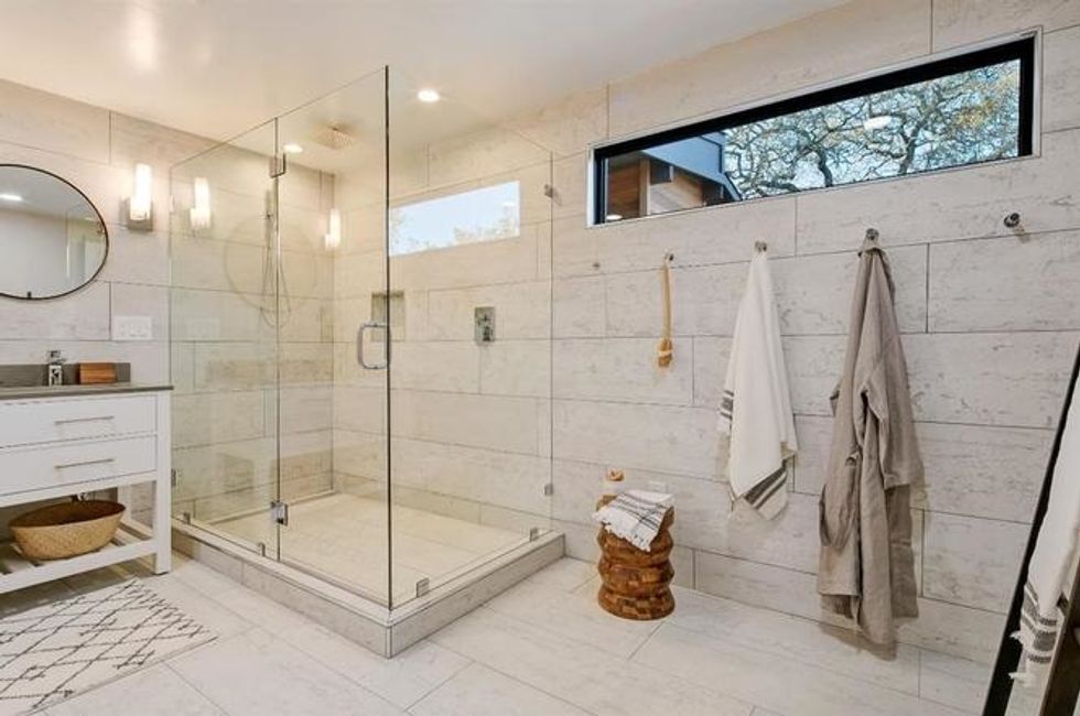 The great room sits adjacent to the culinary space and feels just as airy, with high beamed ceilings, dramatic cantina doors, and a cozy fireplace. Walk through the glass doors onto the sprawling wood deck immersed in a grove of trees.
