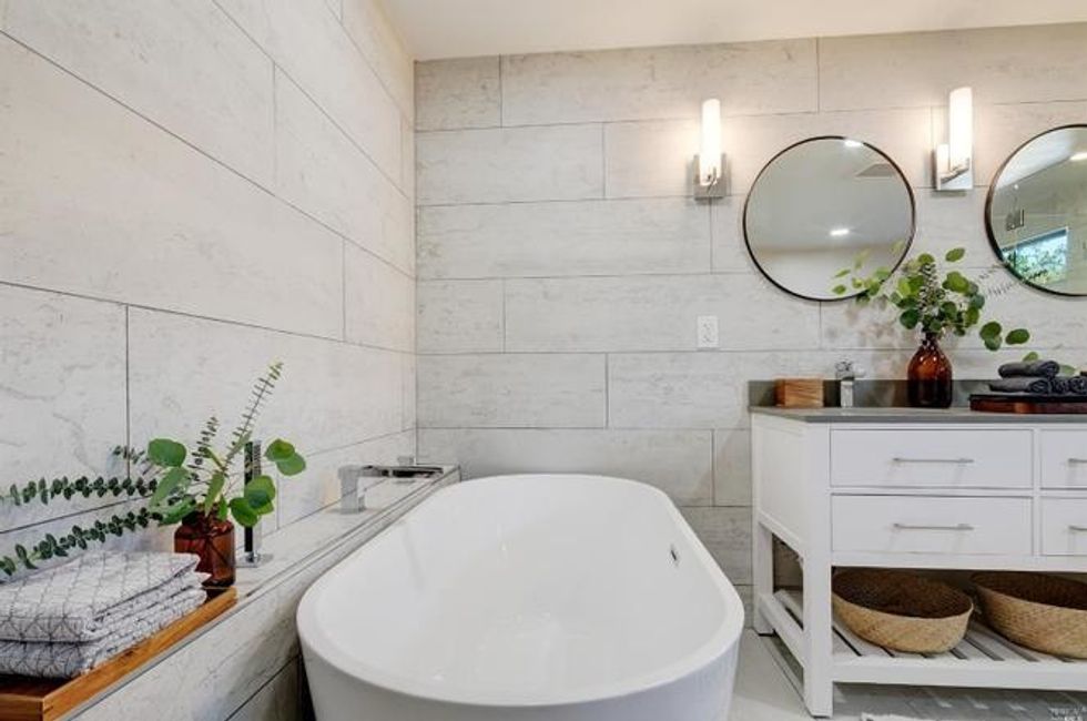 The master suite, too, has its own sitting area and private deck, as well as a massive walk-in closet. The chic master bath has a double sink vanity, shower, and luxurious soaking tub.