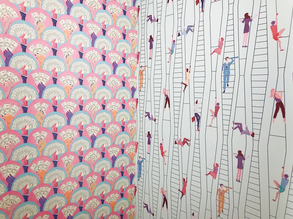 A final installation, called "Wallflowers," turns feminist themes (beauty and self-acceptance, imposter syndrome, intersectionality, and more) into eight fabulous wallpapers we could easily imagine in a splashy bachelorette pad. (We're super partial to artist Flavia Gonazales' Art Deco-inspired "Money Fan" print that makes a statement on the wage gap.)