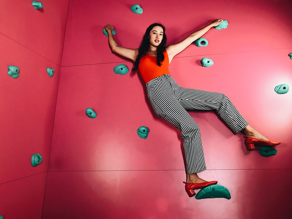 Erin Fong of Western Editions scales the Corporate Climb rock wall.