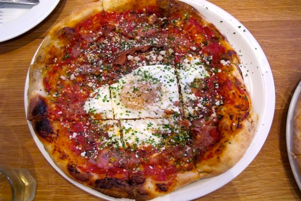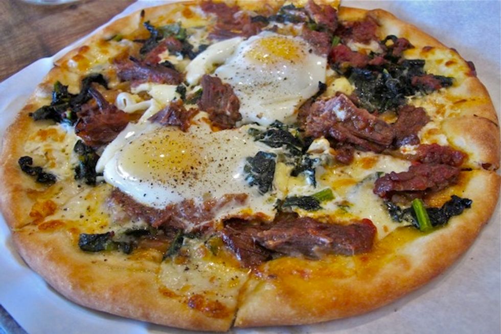 This one is a Michael Bauer favorite, and we have to say it is worth the trip to Glen Park. It's another gas-fired pizza that comes out beautifully and satisfyingly crisp from edge to center, topped with tomato, pancetta, chilies, Pecorino, and a farm egg. The combination derives from a classic Roman dish, spaghetti all'Amatriciana, which comes with a tomato sauce flavored with guanciale, pepper, and Pecorino. In Gialina's pizza version spicy and delicious, and beats out other versions at Pizzeria Delfina and Gialina's own sister restaurant, Ragazza. Photo below courtesy of Deep Dishing.