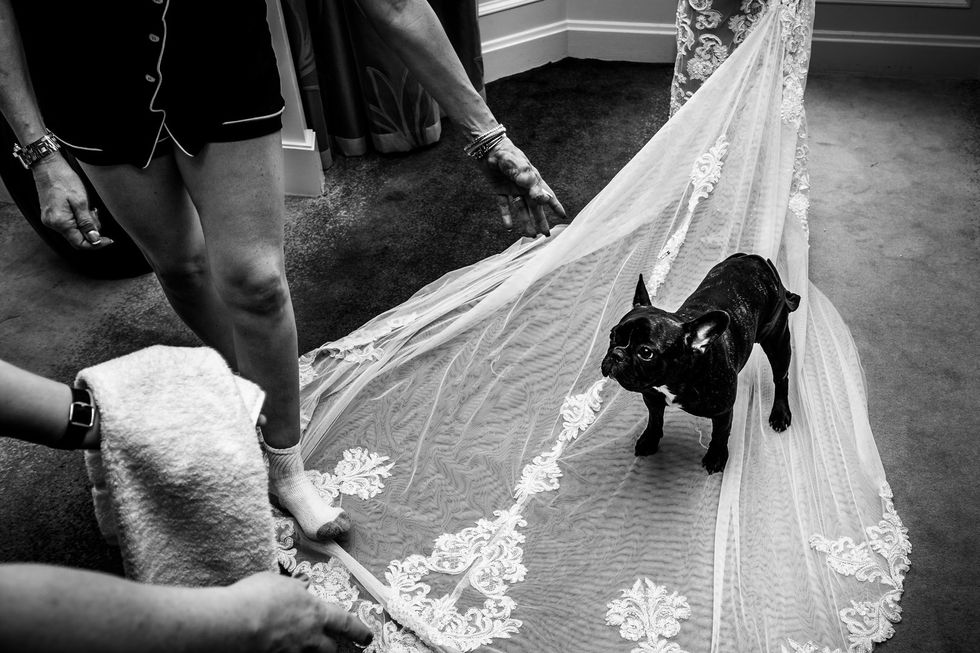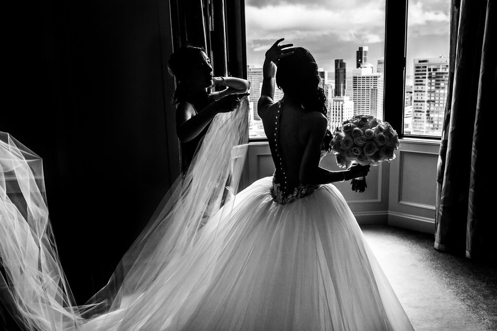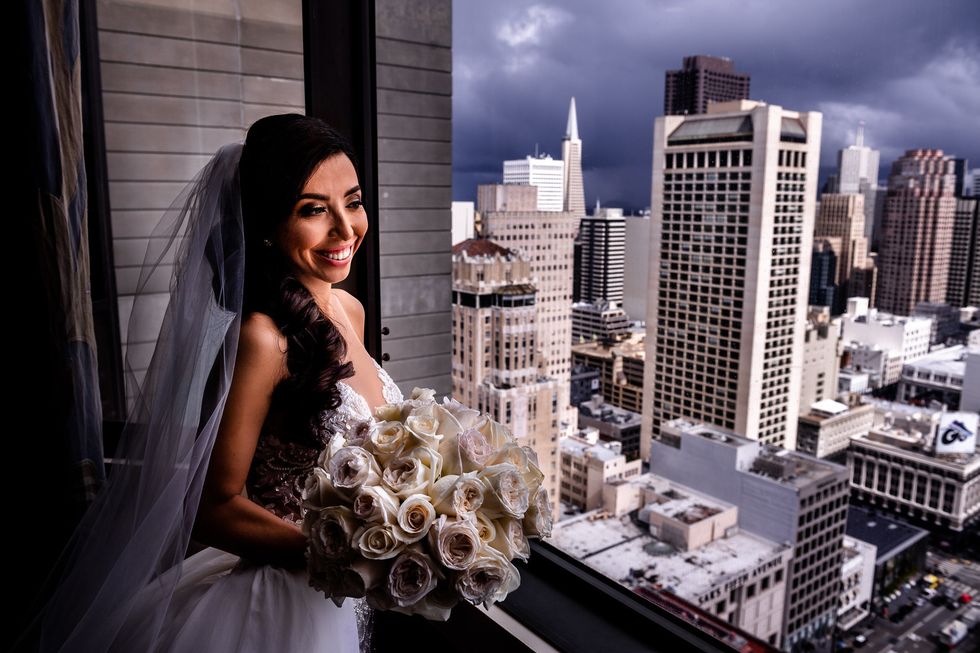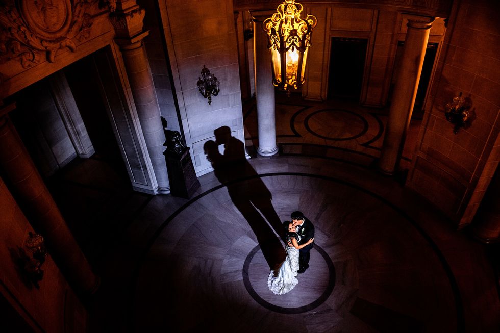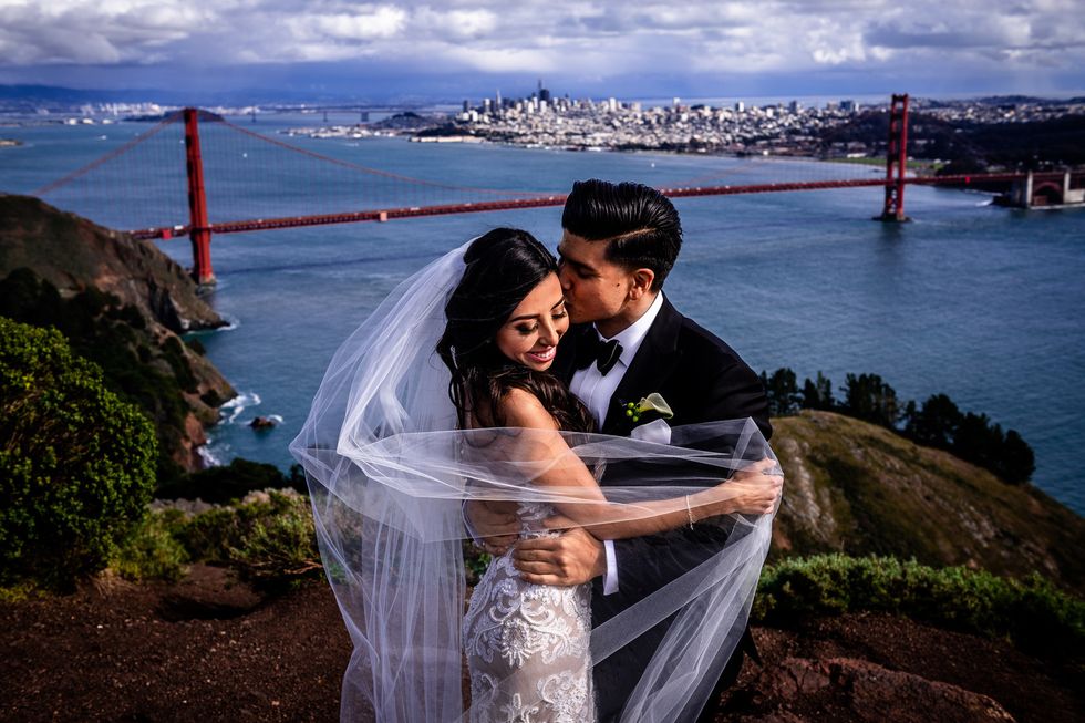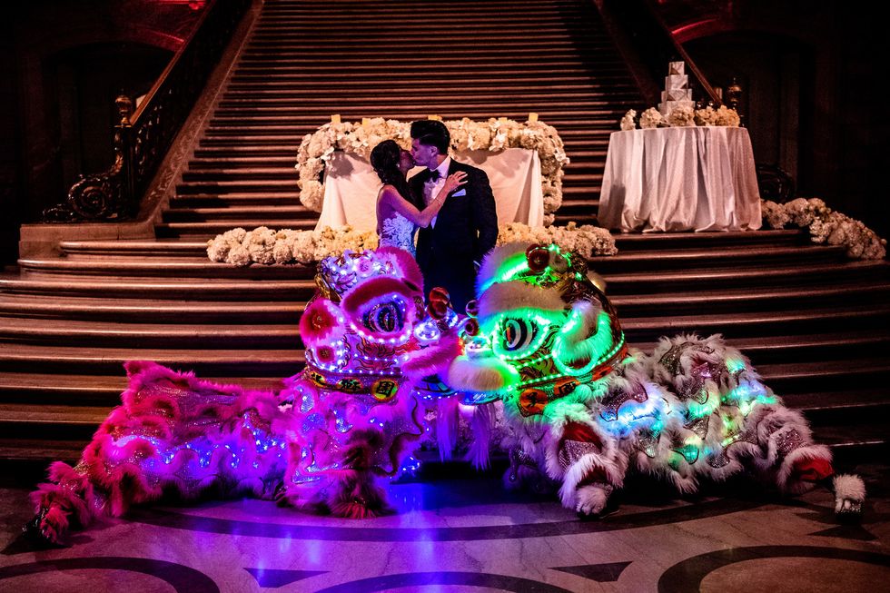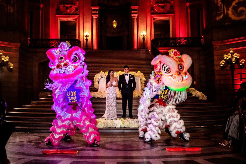 But then, the hurricane came. Irma blew through, not only disrupting their wedding plans but also destroying their new home, flooding it with seawater. They moved five times in four months before getting back on their feet. And while you might think they'd be happy to stay close to home, in adventurous spirit, the couple chose a destination across the country, in San Francisco, where they would meld the traditions of both of their cultural backgrounds. Chinese lion dancers came soaring in to greet the newlyweds at their sweetheart table, twisting and jumping; they ended with a smooch, as did the lovebirds.